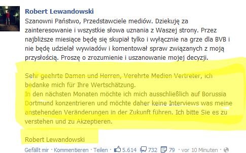 Die jüngsten Entwicklungen rund um die Vertragssituation von Robert Lewandowski und seinen nun verkündeten Wechsel vom BVB zum FC Bayern München im kommenden Sommer, welche mit heftigen und emotionalen Reaktionen der Fans quer durch die Republik verbunden waren und noch immer sind, haben den Polen offenbar nun dazu veranlasst in den nächsten Monaten keine Interviews zu diesem Themenbereich mehr geben zu wollen, wie er gerade auf seiner Facebookseite bekannt gab (siehe oben).