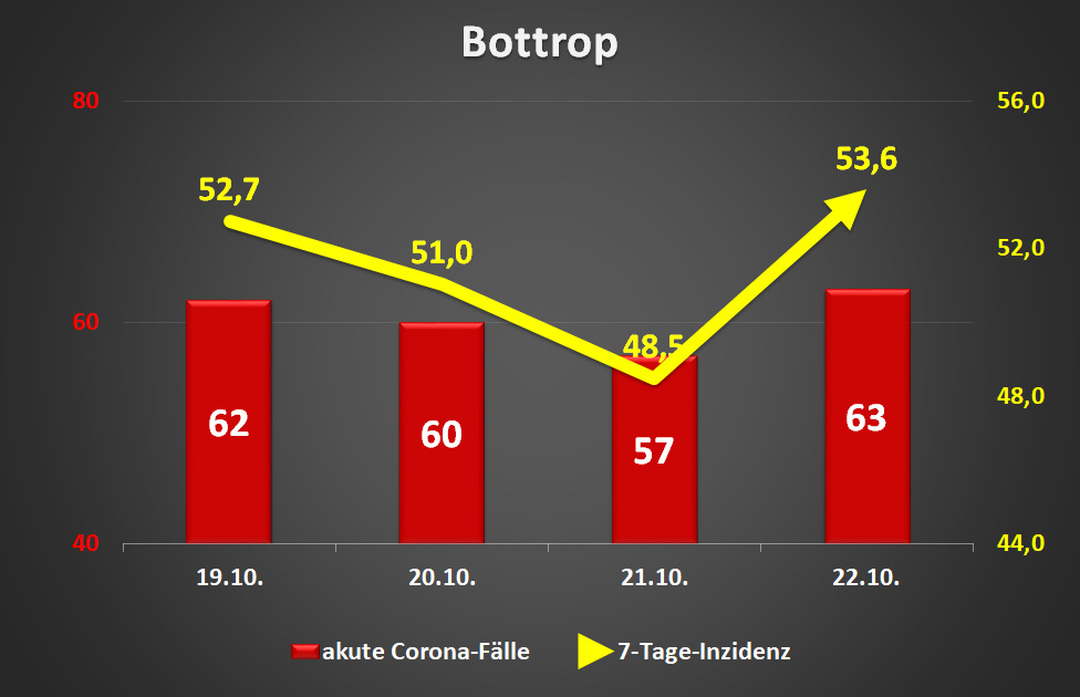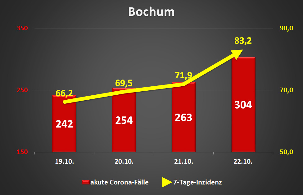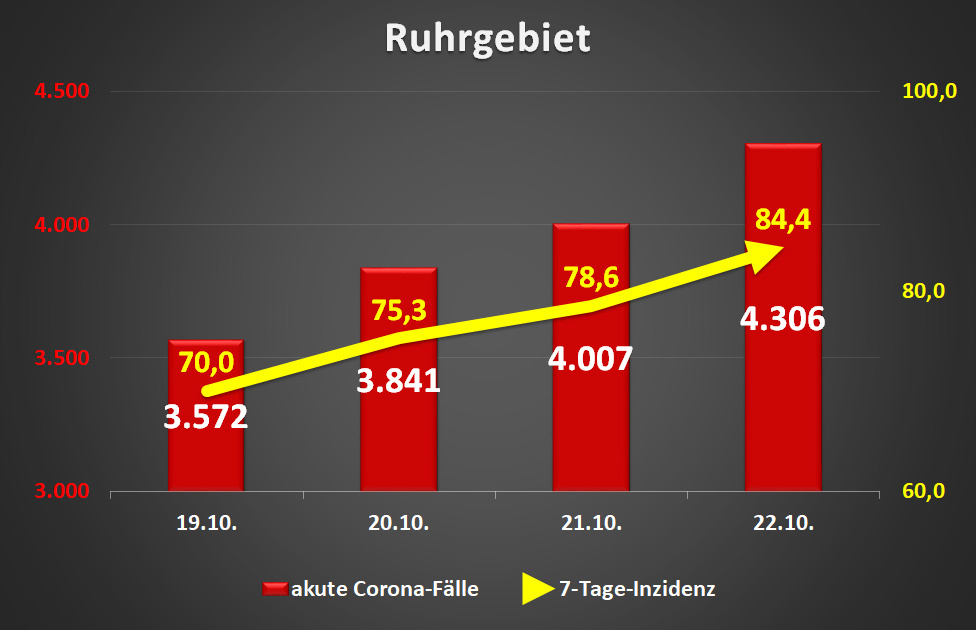 Im Ruhrgebiet sind nun 4.300 (+ 300) Menschen als infiziert gemeldet. Die Inzidenz steigt um fast sechs Punkte auf 84. Aus ganz NRW gibt es 12.700 gemeldete Fälle, davon 2.600 Neuinfizierte. Die Inzidenz steigt auf 71 (+4). Unter den Flächenländern ist die Lage nur in Hessen noch schlimmer. Die Zahl der NRW-Todesfälle steigt um 10 auf insgesamt 1.980 seit Ausbruch der Pandemie.