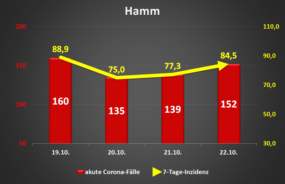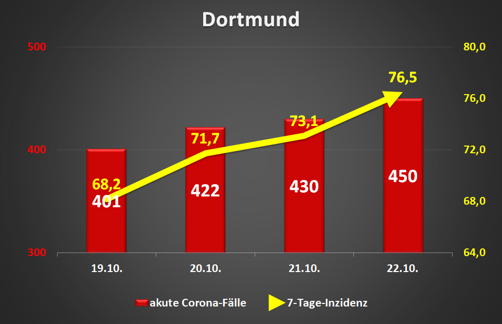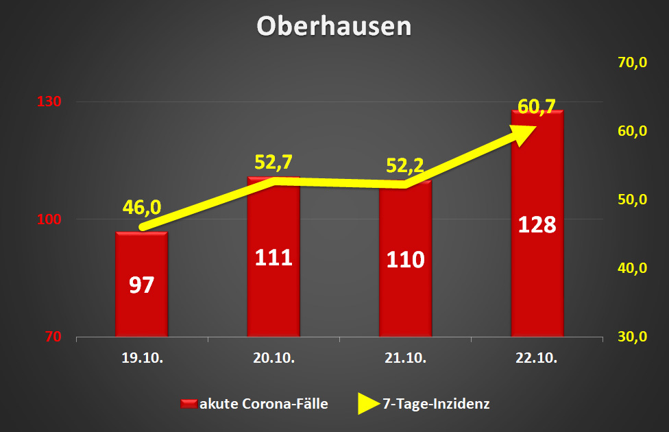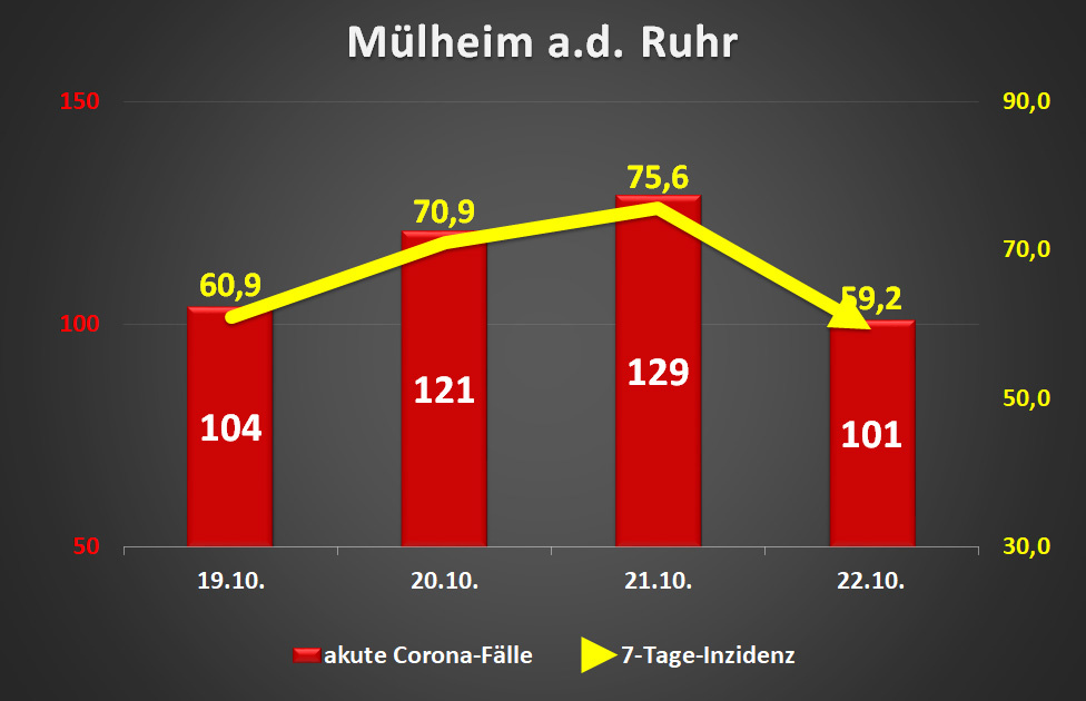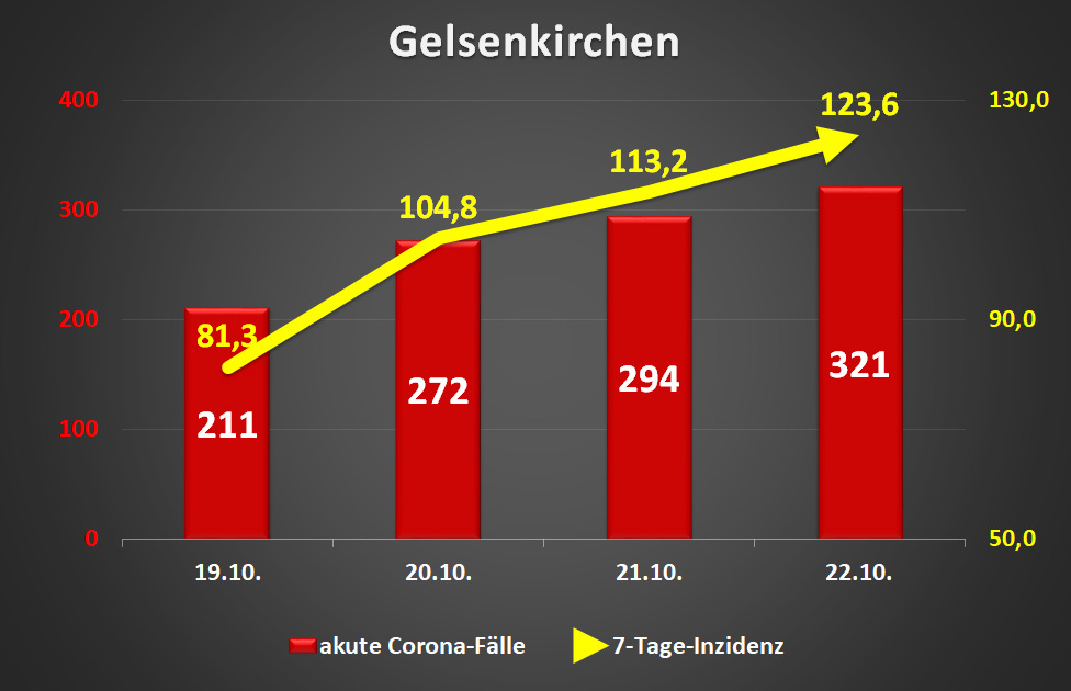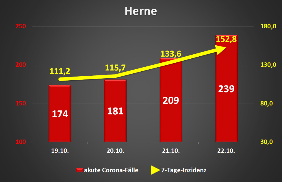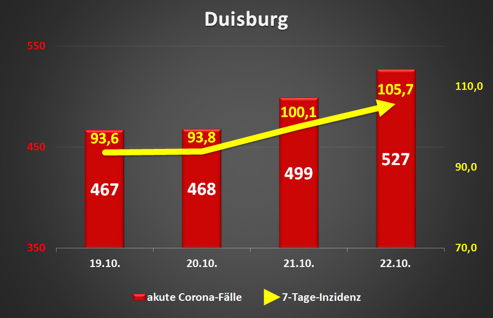 Herne, Gelsenkirchen, Duisburg – diese drei Ruhr-Städte haben eine 7-Tage-Inzidenz über 100. Herne verschlechtert sich auf Platz 5 in Deutschland mit einer Inzidenz von 152 – ein Plus von fast 20 Punkten. Gelsenkirchen steht im Ruhrgebiet auf Platz 2 mit 123 (+10) und Duisburg auf Platz 3 mit 105 (+5).