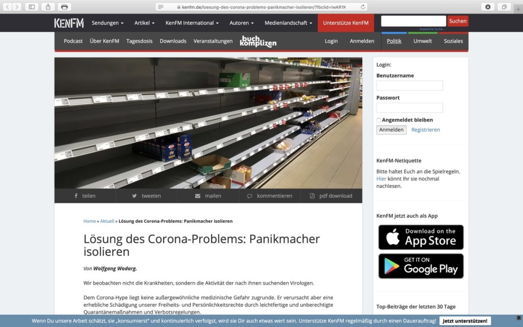 Die bekannten Leugner und Verharmloser einer Corona-Pandemie werden aktuell bei KenFM verlinkt bzw. ihre Videos eingebunden. Vermittelte Botschaft der Beiträge: „Alles Panikmache!“