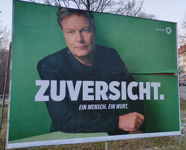 Die Grünen setzen statt auf „Sicherheit“ auf die hohle Phrase „Ein Mensch. Ein Wort.“. Der schlechteste Wirtschaftsminister aller Zeiten verknüpft diese mit „Zuversicht“. Naja, die Hoffnung stirbt zuletzt. Aber wer noch Hoffnung auf eine Stabilisierung der Wirtschaft in Deutschland hat, wird wohl kaum die Grünen wählen. Die Außenministerin ist auch dabei. Sie hat mit ihrer „Feministischen Außenpolitik“ nicht nur für Unmut, sondern auch für manchen Lacher gesorgt. Feministisch war da leider gar nichts. Vor allem, wenn man an die Situation der Frauen im Iran, in Afghanistan, im Sudan oder in anderen patriarchal regierten Ländern denkt. Ihr „Zusammen“ auf dem Plakat bedeutet wohl am ehesten, dass sie es allein nicht gepackt hat. Aber die Annalena, die vom Völkerrecht kommt, war wirklich stets bemüht…