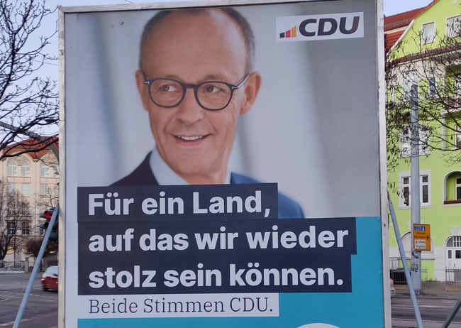 Zum Schluss grinst mich Friedrich Merz von seinem Plakat an. Und ich stelle mir ganz voreingenommen die Frage: Warum muss die CDU eine so unsympathische Person als Kanzlerkandidat aufstellen? Merz geht jetzt auf Nummer sicher, um wenigstens seine 30 % zu behalten, und versucht, möglichst keine Fehler zu machen. Mit dieser Art Vermeidungswahlkampf wird ihm das wohl auch gelingen. Die Frage ist natürlich, wie bzw. mit wem es dann weitergeht. Mit der SPD, die die Ukraine hängen lässt und sich Putin anbiedert, oder mit den Grünen, die weiter ihre akademisch-ideologische Wohlstandsagenda verfolgen?