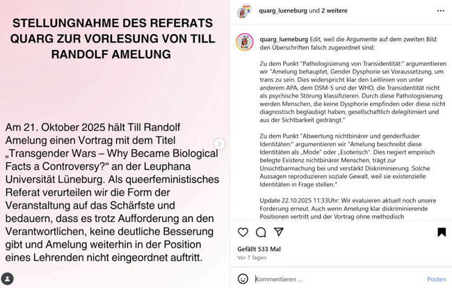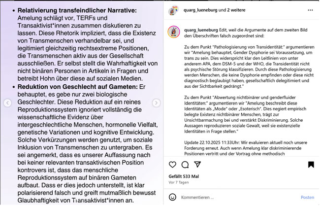Das Posting der Gruppe QuARG verbreitet ebenfalls Quark – sie schaffen es sich auch noch, zur biologischen Definition von Geschlecht selbst zu widersprechen: “Er behauptet, es gäbe nur zwei Geschlechter. Diese Reduktion auf ein reines Reproduktionssystem ignoriert vollständig die wissenschaftliche Evidenz über intergeschlechtliche Menschen, hormonelle Vielfalt, genetische Variationen und kognitive Entwicklung. Solche Verkürzungen werden genutzt, um soziale Inklusion von Transmenschen zu untergraben. Es sei angemerkt, dass es unserer Auffassung nach bei keiner relevanten transaktivistischen Position kontrovers ist, dass das menschliche Reproduktionssystem auf zwei Gameten aufbaut. Dass er dies jedoch unterstellt, ist klar polarisierend falsch und greift mutmaßlich bewusst Glaubhaftigkeit von Transaktivist*innen an.“