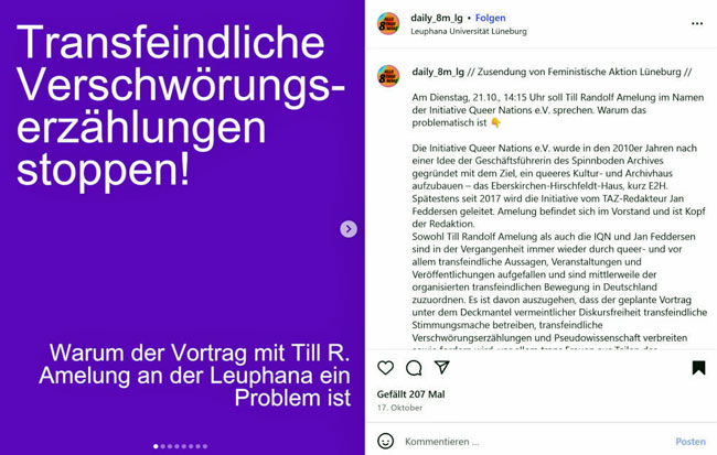 Auf Instagram wurden außerdem Postings gegen mich und die Veranstaltung veröffentlicht, die vor Diffamierungen nur so strotzten. Auch dies ist nicht neu für mich. Der Account „Alle Tage 8. März“ behauptete, ich würde „transfeindliche Verschwörungserzählungen“ verbreiten. „Problematisch“ sei, dass ich für die Initiative Queer Nations e.V. spräche, weil: