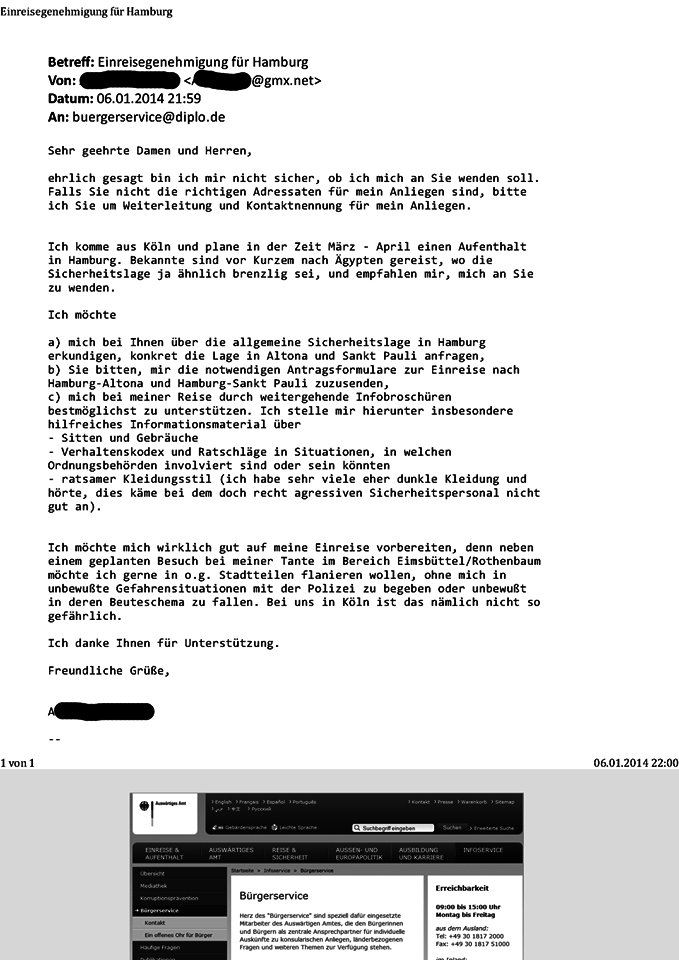 Ich sah mich genötigt, die Behörden auf eine Situation aufmerksam machen zu müssen, über die ihnen selbst noch keine Informationen vorlagen. Jedenfalls sah sich keiner der der drei Bürgerservice-Stellen der Behörden im Stande, mir in der Sache zu helfen, damit ich mit der notwendigen Sicherheit nach Hamburg reisen kann.