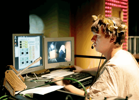Ich sitze an der Schnittstelle eines technischen Aufbaus,der aus Computern, acht über die Bühne verteilten Kameras, drei Bildschirmen und einer Leinwand besteht. Ich habe ein Programm geschrieben, das mir erlaubt, Bildwelten zu kreieren, die dem Stück eine weitere