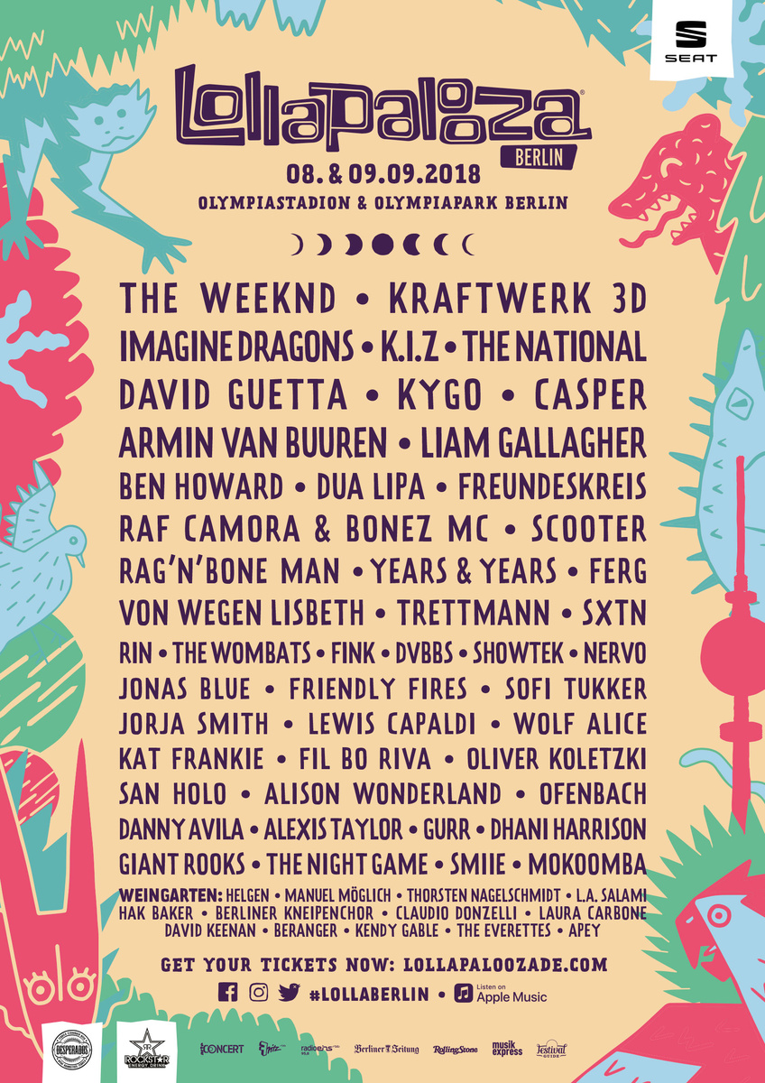 Ausserdem ist seit heute der erste Geländeplan da! Jetzt heißt es rausfinden, wo The Weeknd, der mit „My Dear Melancholy“ gerade erst völlig überraschend ein neues Album veröffentlicht hat, seine einzige Europashow in diesem Jahr spielt. Auf welcher Bühne gibt es die 3D-Show von Kraftwerk? Wo rocken Imagine Dragons und The National? Wer dreht im Olympiastadion neben David Guetta, Kygo und Armin van Buuren an den Reglern? All das lässt sich ab sofort unter www.lollapaloozade.com auschecken!