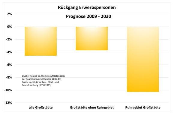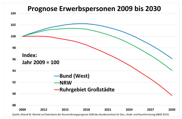 Dieser prognostizierte dramatische Rückgang der Erwerbspersonen in den großen Ruhrgebietsstädten ist für die Wirtschaftsentwicklung der Region äußerst problematisch. Unter Erwerbspersonen fassen nämlich die Statistiker die arbeitsfähigen und arbeitswilligen Menschen ab 15 Jahren zusammen. Dies sind die Menschen, die für die Wirtschaftskraft relevanten sind, weil sie das Sozialprodukt erarbeiten. Sie sind die wirtschaftlichen Leistungsträger einer Gesellschaft, ihre Arbeitsleistung ist entscheidend für unseren Wohlstand. Weniger Erwerbspersonen bedeuten weniger Wohlstand, wenn kein Wunder passiert, wie zum Beispiel ein großer Produktivitätssprung durch neue Technologien. Aber damit ist im Ruhrgebiet nicht zu rechnen, die Zeit der großen, bahnbrechenden Innovationen steht in den Büchern zur Industriegeschichte.
