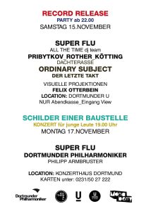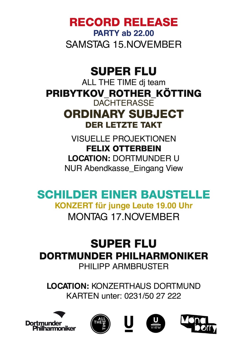 Heute Abend feiert das Kunst- und Musikkollektiv All The Time gemeinsam mit dem aus Halle an der Saale stammenden Elektronik-Duo Super Flu die Veröffentlichung einer Schallplatte, welche die Musiker gemeinsam mit den Dortmunder Philharmonikern aufgenommen haben. Am kommenden Montag findet dann im Konzerthaus Dortmund eine Live Darbietung der Dortmunder Philharmoniker mit dem DJ Duo statt. Unter dem Titel „Schilder einer Baustelle“ werden Themen aus der Mussorgski Komposition „Bilder einer Ausstellung“ neu interpretiert und mit Beats, Grooves, Sythti-Sounds und Feld Recordings unterlegt. „Mussorgskimeetsfeel-good Tech-House“, heißt es aus der PR Abteilung der Dortmunder Philharmoniker und ein „unvergesslicher Abend“ wird prognostiziert.