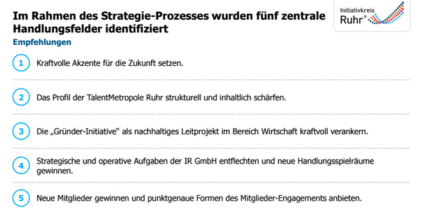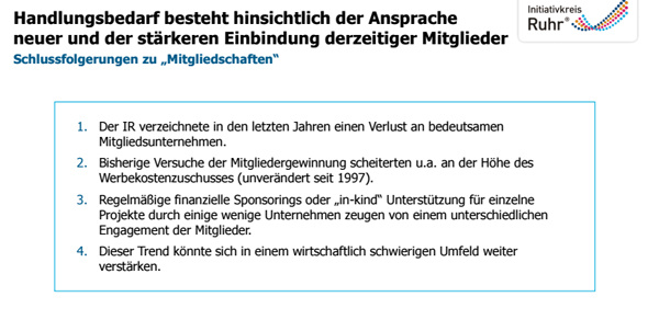 Frag man man Initiativkreis Ruhr (IR) nach, wie es um die Entwicklung seiner Mitglieder steht, erhält man von dem unter anderem von dem damaligen Deutsche Band Vorstandsvorsitzenden Alfred Herrhausen und dem Ruhrbischof Franz Hengsbach 1989 gegründete Verein, eine Antwort, in der von Problemen nicht die Rede ist: