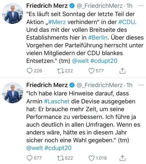 Obwohl es natürlich verständlich ist, dass sich Merz gerade darüber ärgert, dass sein möglicher Sieg bei der Wahl zum Parteivorsitzenden durch eine angedachte Verschiebung um mehrere Monate noch einmal zusätzlich (aus seiner Sicht unnötig) in Gefahr gerät, sind seine öffentlichen Spekulationen und Behauptungen rund um üble Machtspielchen innerhalb der Partei doch ein Armutszeugnis.
