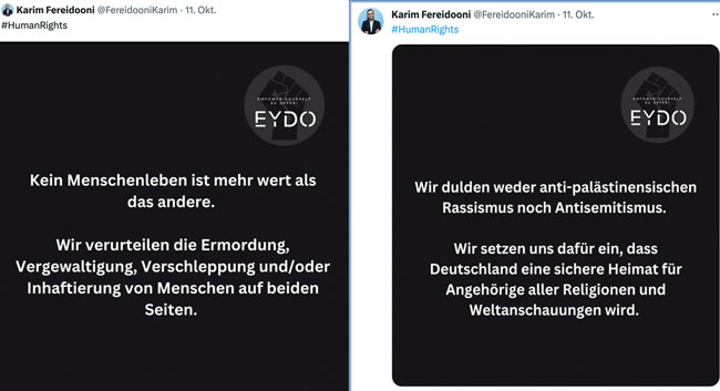 Sie standen auf Kacheln des Düsseldorfer Vereins „Empower Yourself, Du Opfer“, bei dessen Shows auch der als „The Brain“ bezeichnete Karim Fereidooni auftrat, ein Professor der Ruhr Universität Bochum und Antirassismusforscher, der die Posts auch teilte und damit auf X eine Kontroverse auslöste. Hätte er sie vor vier Wochen geteilt, hätte es kaum jemanden außerhalb seiner Blase interessiert. Aber vier Tage nach Beginn des Überfalls der Hamas-Schlächter auf Israel war die Bereitschaft bei vielen deutlich geringer, solche Postings einfach hinzunehmen. Mit „Der schiefe Vergleich ist die postmoderne Paradedisziplin“ schrieb Petra Klug im vergangenen Jahr in der taz einen Satz für die Ewigkeit. Nichts von dem, was Fereidooni geteilt hat, ist auf den ersten Blick ein Grund, sich aufzuregen. Ein Grund, etwas genauer hinzuschauen, ist es allerings schon. In einem der Postings werden Antisemitismus und ein angeblich vorhandener „antipalästinensischer Rassismus“ auf eine Stufe gestellt. Antisemitismus ist ein Jahrtausende altes Phänomen, dem Millionen Juden zum Opfer gefallen sind. Es gibt ihn in einer religiösen Ausprägung sowohl im Islam als auch im Christentum. Im linken Antisemitismus werden Juden mit den Problemen des Kapitalismus häufig persönlich direkt in Verbindung gebracht, wenn eine verkürzte Kapitalismuskritik sich nicht mit den Strukturen, sondern „den Kapitalisten“ beschäftig. Der völkische Antisemitismus, der für den Nationalsozialismus prägend war, verband sich die verkürzte Kapitalismuskritik mit einem paranoiden, angstgeprägten Gefühl der Unterlegenheit und wollte, wie übrigens auch die Hamas, die Juden weltweit ausrotten. Der angebliche anti-palästinensische Rassismus ist nicht einmal so alt wie die Serie Blacklist, deren letzte Staffel in diesem Jahr herauskam: Er geht offenbar auf Ramsis Kilani zurück, der ihn 2019 „zur Diskussion“ gestellt haben soll. Ramsis Kilani hat palästinensische Wurzeln, studierte damals in Siegen und war seinerzeit auch Aktivist. In Interviews und Berichten wird wurde er damals als Mitglied der Linkspartei, der trotzkistischen Gruppe Marx21 und von „Palästina spricht“ vorgestellt. „Palästina spricht“ war für viele antiisraelische Demonstrationen in den vergangenen Jahren verantwortlich und äußerte sich auch jetzt begeistert über den Überfall der Hamas und der mit ihr verbündeten Terrorbanden auf Israel am 7. Oktober. Antisemitismus auf eine Stufe mit dem von einem linksradikalen Israelhasser erfundenen „anti-palästinensische Rassismus“ auf eine Stufe zu stellen, das ist schon mehr als fragwürdig.
