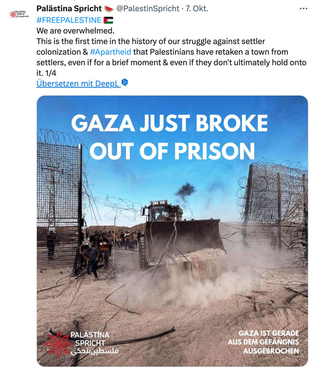 „Kein Menschenleben ist mehr wert als das andere. Wir verurteilen die Ermordung, Vergewaltigung, Verschleppung und/oder Inhaftierung von Menschen auf beiden Seiten.“ Das dort „auf beiden Seiten“ steht und nicht zum Beispiel „auf allen Seiten und zu allen Zeiten“, macht klar, auf was sich das Posting bezieht: den Angriff der Hamas auf Israel, dem bislang über 1400 Israelis zum Opfer fielen. Er stellt wieder auf eine Stufe, was nicht auf eine Stufe gestellt gehört: Israel und seine Bürger sind die Opfer. Es gab keine Vergewaltigungen von israelischer Seite und die Hamas nahm keine Inhaftierungen vor, sie nahm Geiseln und viele von ihnen sind noch Babys. Israelische Militärs haben auch nicht 260 Rave-Kids abgeschlachtet oder Holocaust-Opfer entführt.