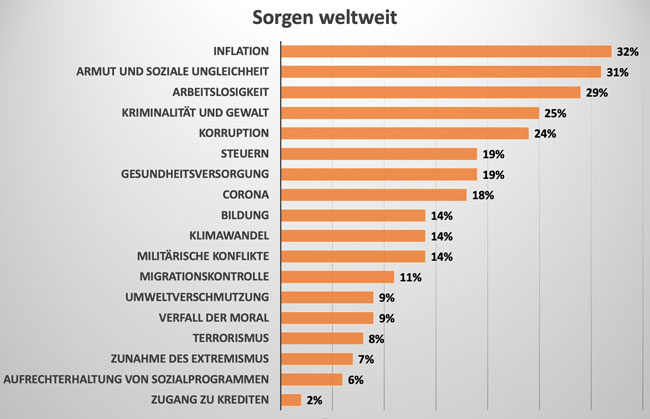 Die Angst vor einer durch den Klimawandel ausgelösten Apokalypse ist weltweit höchst unterschiedlich ausgeprägt. Im April 2022 befragte das französische Marktforschungsunternehmen IPSOS Menschen aus 27 Ländern, welche drei Themen ihnen die meisten Sorgen bereiten würden. Das Ergebnis: An erster Stelle lag die Inflation. Energie und Lebensmittel werden weltweit teurer. Der Klimawandel, in Deutschland seit Jahren das Thema Nummer 1 in den Medien und der Politik kam global gerade einmal auf Platz zehn: