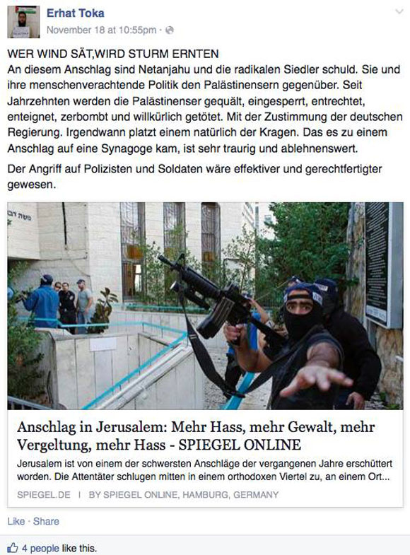 In den vergangen Tagen rief Toka dann noch zu Spenden für die Hamas auf, die mit dem Begriff „islamistisch“ noch zurückhaltend beschrieben ist, allerdings als Ableger der Muslim Bruderschaft in der Traditionslinie des radikalen Islamismus steht.