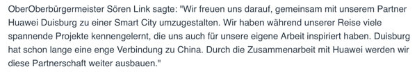 Mit dem Projekt Smart City hat Duisburg Huawei als Kooperationspartner. Huawei produziert nicht nur Geräte für den Endverbraucher: Wichtiger für Huawei ist die Technologie, die in Mobilfunkmasten benötigt wird. Bei dieser Technologie ist Huawei Weltmarktführer. Huawei hat, im Jahre 2017, mehr Patente in Europa angemeldet als jedes andere Unternehmen.