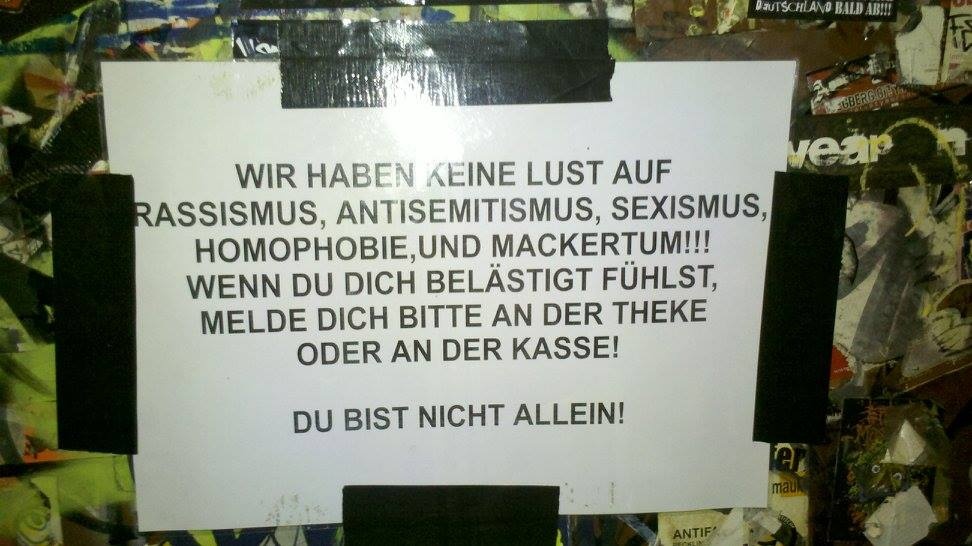 „Wir haben keine Lust auf Rassismus, Antisemitismus, Sexismus, Homophobie und Mackertum!!! Wenn du dich belästigt fühlst, melde dich bitte an der Theke oder an der Kasse! Du bist nicht allein!“