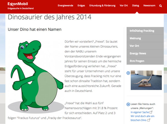 Der Naturschutzbund Deutschlands (NABU) hat Exxon zum Dinosaurier des Jahres gekürt. Der Grund: Exxon setzt auf Erdgasförderung in Deutschland, der Nabu will lieber weiterhin das Milliarden in die Subventionierung Erneuerbarer Energien gesteckt werden und die Umverteilungsmaschinerie Energiewende nicht ins stocken gerät. Und während Unternehmen wie RWE oder E.On den Öko-Funktionären nach dem Mund reden und den eigenen Mitarbeitern in den Rücken fallen – wer bei RWE im Braunkohlebereich arbeitet, scheint ja im eigenen Unternehmen nicht mehr erwünscht zu sein, so sehr schwärmt der ebenso taumelnde wie dumme Energieriese davon, das irgendwann nur noch subventionierte Strom produziert werden soll – geht Exxon einen anderen Weg: Man ließ für den Dino einen süßen Namen wählen, machte eine drollige Comicfigur daraus und lud die Ökofunktionäre zur Diskussion ein. Und vor allem stellte das Unternehmen klar, dass es sein Handeln für richtig hält. Das tut man bei RWE und E.On schon lange nur noch hinter vorgehaltener Hand. Geht das Mikro an, wird vor den Ökos gekatzbuckelt.