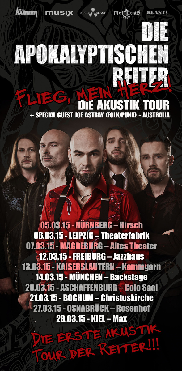 Ebenfalls ans Herz legen möchte ich euch die erste Akustik-Tour “Flieg, Mein Herz!” der Apokalyptischen Reiter im März nächsten Jahres. Am 21.3.2015 werden sie in der Christuskirche in Bochum spielen und der Vorverkauf hat bereits begonnen.