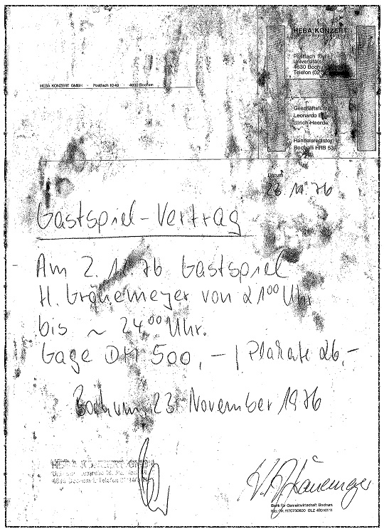 Dass damit die Keimzelle des Bermuda3ecks entstanden war, konnte damals allerdings noch niemand ahnen, denn hier wurde die das B3E später prägende Außengastronomie erfunden. Ebenso wenig konnte sich jemand zu diesem Zeitpunkt vorstellen, dass Herbert Grönemeyer, der dort immer wieder mal auftrat, zum internationalen Film- und Gesangsstar werden würde. Er hatte seit seinem 15. Lebensjahr im nahegelegenen Schauspielhaus gejobbt und später als Dauerstudent für Musik und Jura an der Ruhr-Universität das damals noch überschaubare Bochumer Nachtleben erkundet. Auch seine Gagen waren, wie man am folgenden Dokument noch gut erkennen kann, im Verhältnis zu seinen heutigen, von geradezu lächerlicher Dimension.