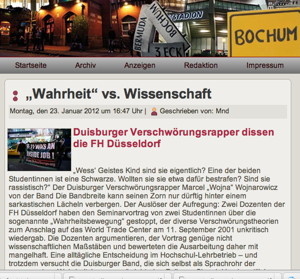 Das Duisburger Schlagerduo „Die Bandbreite“ hat auf seiner Internetseite über einen Fall an der FH Düsseldorf berichtet, bei dem zwei Studentinnen genötigt wurden, einen Text zu schreiben und dann doch keinen Schein bekamen. Ihr Thema war die „Wahrheitsbewegung.