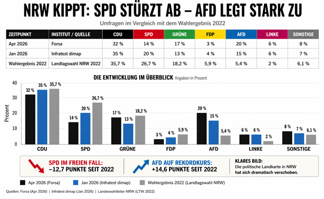Ob Wirtschaft, Verkehr, Kitas oder Migration: Eine gestern veröffentlichte Forsa-Umfrage der Tageszeitungen in Nordrhein-Westfalen belegt die Unzufriedenheit der Bürger im einwohnerreichsten Bundesland. Doch ein Jahr vor der Landtagswahl verfügt die schwarz-grüne Koalition unter Ministerpräsident Hendrik Wüst (CDU) über eine stabile Mehrheit. Nicht, weil sie gute Arbeit macht, sondern weil immer mehr Menschen das Land aufgegeben haben: 31 Prozent glauben, dass keine Partei in der Lage sei, die Probleme des Landes zu lösen. Eine demokratische Alternative zu Schwarz-Grün sehen sie nicht. Die SPD fällt auf 14 Prozent. Eine reale Chance, Wüst als Ministerpräsident abzulösen, hatte ihr offener, kluger und streitbarer Spitzenkandidat Jochen Ott zwar nie, aber nun wird es sogar zunehmend unwahrscheinlich, dass die SPD im kommenden Jahr mit der Union über eine schwarz-rote Koalition verhandeln könnte. Nur acht Prozent der Bürger kennen Ott und dass er sich in NRW gegen den Verfall seiner Partei auch auf Bundesebene – bei einer Bundestagswahl würden sogar nur noch 13 Prozent in NRW ihr Kreuz bei der SPD machen – stellen kann, dürfte ausgeschlossen sein. Die SPD ist auf dem Weg zur Kleinpartei, die Hegemonie im linken Lager haben seit Jahren die Grünen und die Sozialdemokraten haben längst kein eigenes Profil mehr.