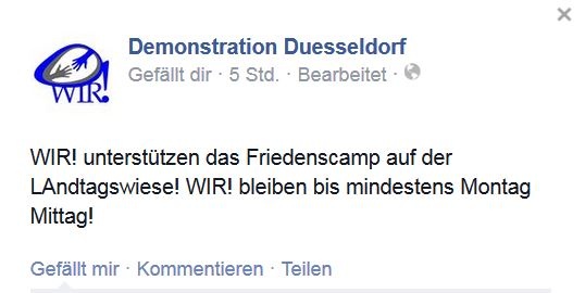 Nach dem Ende der Kundgebung um ca. 22 Uhr wurde der „Marsch auf den Landtag“ in ein „Friedenscamp Landtag NRW“ umgewandelt. Die Initiatoren verkündeten über ihre Facebookseite:
