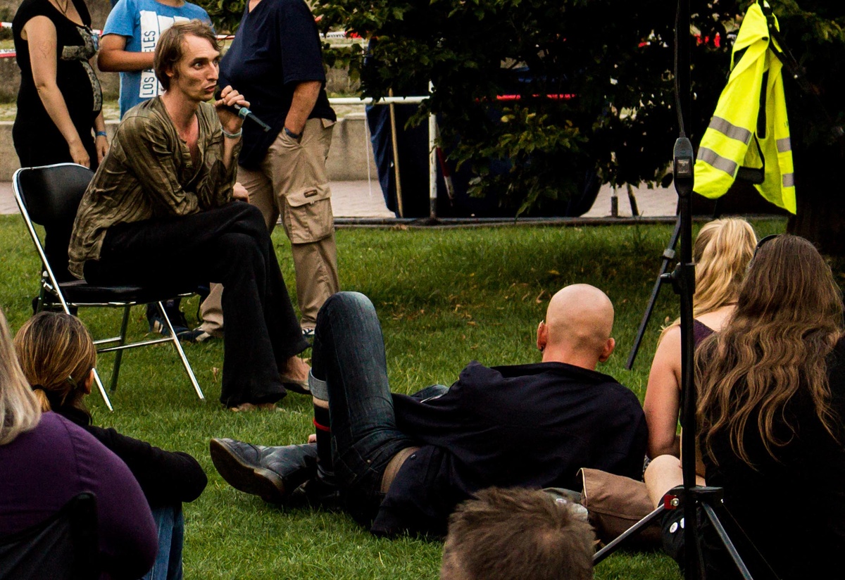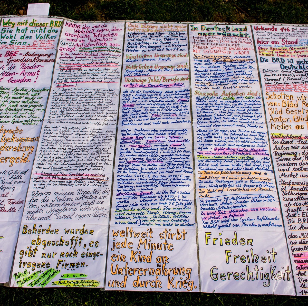 Mehrere Quadratmeter beschriebener Zettel, die von einem als „Kunst-Objekt“ deklarierten Sonnenschirm hingen oder auf dem Boden ausgebreitet worden waren, ergänzten die Redebeiträge. Selbstredend wurde auch hier vor der „Neuen Weltordnung“, den „Mainstream-Medien“ und der Steuerung des Weltgeschehens durch die „Bilderberger Konferenz“ gewarnt. Das bedingungslose Grundeinkommen wurde eingefordert. Die Bundesrepublik sei eine GmbH unter Kontrolle der Alliierten. Zudem seien die Deutschen durch einen geheimen Staatsstreich am 8. Dezember 2012 staatenlos geworden. Eine schnellere Internetverbindung müsse her. Daneben wurde die Altersarmut kritisiert, eine gesunde, kostenlose Ernährung durch Selbstversorgung beworben und über die globale Versklavung der Menschen durch die „skrupellose Verbrecher-Elite“ „aufgeklärt“.