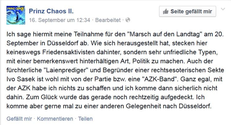 Der „Marsch auf den Landtag NRW“ sollte diesen Trend umkehren. Statt einer Wiederbelebung der Bewegung bestätigte sich allerdings nur deren fortschreitender Zerfall. Schon im Vorfeld kam es zu verbitterten Querelen, ausgelöst durch den angekündigten Auftritt von Musikanten aus dem Umfeld der „Organischen Christus Generation“ des Schweizer Laienpredigers Ivo Sassek. Via Facebook warnte der Liedermacher Prinz Chaos II. vor der „rechtsesoterischen Sekte“, auf deren „Antizensurkonferenz“ (AZK) neben hochrangigen Schweizer Scientologen auch die rechtsextreme Rechtsanwältin und Holocaustleugnerin Sylvia Stolz mit tosendem Applaus als standhafte Verteidigerin der Meinungsfreiheit gefeiert wurde.
