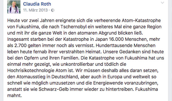 Merkel reagierte schnell: Noch vor der Landtagswahl in Baden-Württemberg am 27. März verkündete sie ein „Kernkraft-Moratorium“. Die kurz zuvor von der schwarz-gelben Bundesregierung verkündete Laufzeitverlängerung, die Rücknahme des ersten, von Rot-Grün 2002 beschlossenen Ausstiegs, wurde für drei Monate ausgesetzt und die Abschaltung der sieben ältesten deutschen Reaktoren beschlossen. Das erneute Aus für die Kernkraft kam dann mit den Stimmen von CDU und FDP drei Monate später.