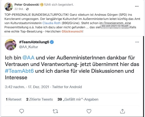 Nach einer Meldung des Kulturjournalisten Peter Grabowski wird Andreas Görgen (SPD) Claudia Roths Amtsleiter.