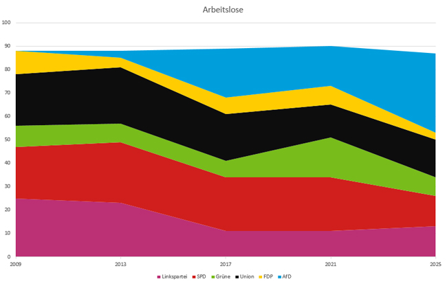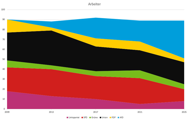 Fasst man Linkspartei, SPD und Grüne als linkes Lager zusammen, sehen wir, dass bei der Bundestagswahl 2009 die Linksbindung jener sozialen Gruppen noch stark war: 49 bzw. 56 Prozent wählten hier links, bei 46 Prozent insgesamt. Man überperformte bei Arbeitern und Arbeitslosen also. Zumindest gilt das für die SPD und insbesondere die Linkspartei. Denn die Grünen unterperformten schon damals. Die 7/9 Punkte bei elf Prozent sind für eine bildungsbürgerliche Partei aber ein beachtlicher Wert. Bis 2021 sinken die Werte stetig; mit 39/51 Punkten bei 46 Prozent bleibt die Bindung aber stabil. Dann, 2025, sind es nur noch 25/34 Punkte bei 37 Prozent. Die AfD wiederum sorgt mit einer Overperformance (38/34 Punkte bei 21 Prozent) für ein soziopolitisches Beben. Denn 2021 und 2017 lag man bei 21/17 bzw. 21/21, 2013 gar nur bei 6/3 Punkten. Im Osten ist die Verschiebung noch drastischer. Da hatte einst die Linkspartei – 29 Prozent der Oststimmen in 2009 – große Teile beider Gruppen gebunden. Heute ist bei ihnen die AfD hegemonialer, als es die Linke je war.