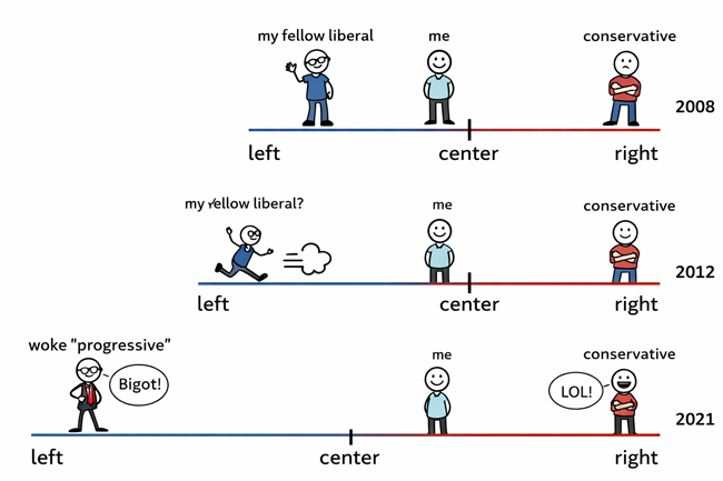 Zu den Schutzbehauptungen linker Identität heute gehört etwa die Vorstellung, die rechten Erfolge basierten auf einem »radikalisierten Konservatismus«, wie es Natascha Strobl nennt. Das ist zum Teil auch richtig; der erste große Boost der AfD, so zwischen 2013 und 2017, stütze sich durchaus auf den rechten Rand der Unionsanhänger. Gleichwohl aber war die Zunahme rechtsextremer Einstellungen in den vergangenen zehn Jahren keineswegs so stark, wie es der elektorale Rechtsruck vermuten lässt. Mehr noch: Man kann durchaus plausibel argumentieren, dass sich in der jüngeren Geschichte das linke bzw. liberale Meinungscluster mehr von der Mitte wegbewegt hat als das rechte. Das zeigte etwa ein Forscherteam um David J. Young jüngst am Beispiel der USA. Es bestätigt damit einen weit verbreiteten Eindruck, der in einem bekannten Meme des Woke-Kritikers Colin Wright verewigt wurde. Linkerseits wurde und wird es oft als rechtes Narrativ abgetan. Nicht zuletzt auch, weil es zu den Lieblingserzählungen des bei Linken verhassten Elon Musk gehört.