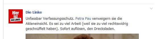 Dass ein Facebookaccount einer etablierten Partei eine recht drastische Ausdrucksweise wählt? Also eine Partei, die seit Jahren von Verfassungsschutz als politisches Instrument beobachtet wird, ärgert sich über diesen „Drecksladen“ und will ihn auflösen? Nur zu. Ich sehe darin kein Problem.