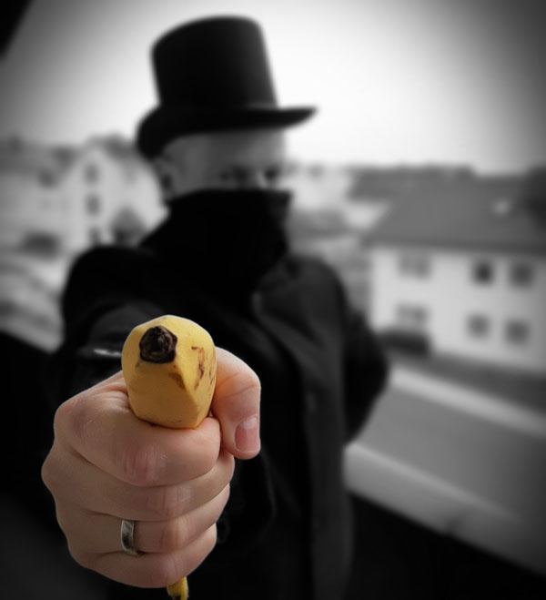 Vegetarier in aller Welt sprechen bis zum heutigen Tag nicht gerne darüber, dass die meisten Überfälle auf vermögende Fleischer im 18. Jahrhundert mit der gefürchteten einschüssigen Bananenpistole begangen wurden, bis Alain Feroc 1902 aus Zorn über einen misslungenen Raubzug seine Waffe aufaß und so erst das Verspeisen von Bananenpistolen populär machte. Denn auch darüber muss endlich einmal offen geredet werden: Vegetarismus ist vor allem eine Geschichte der Gewalt. Hier sei nur kurz auf den Missbrauch von Paprikagranaten und Tötungsdelikten mit dem Karottenmesser hingewiesen. (Hinweis: Das hier abgebildete Foto eines Überfalls mit einer Bananenpistole wurde (nach eingehender Beratung durch Historiker der Alfred-Hembel-Universität) mit einem Laienschauspieler täuschend echt nachgestellt.)