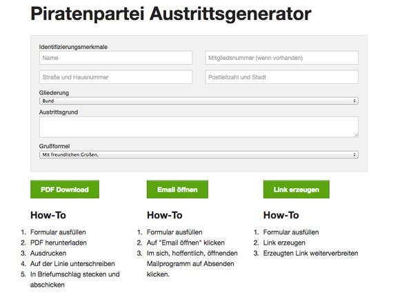 Christopher Lauer, Anke Margarete Domscheit-Berg, Anne Helm, fast alle Aktiven des ganze Landesverbandes Bremen – der Verfall der Piraten schreitet flott voran. Aber der Austritt aus einer Partei ist mühsam – viele die raus wollen, sind wahrscheinlich einfach nur zu faul, das entsprechende Schreiben aufzusetzen. Diesen Menschen wird nun geholfen. Im Internet gibt es einen Austrittsgenerator. Füllt man das Formular aus, wird ein PDF erzeugt, das man ausdrucken kann. Unterschrieben und an die Partei gesandt ist man schon draussen und kann sich auf der Suche nach einem Mandat oder der Gelegenheit, sich ein wenig wichtig zu machen, dem nächsten Hip-Projekt widmen.