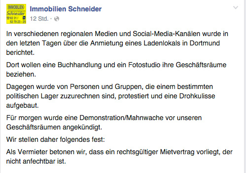 Was machen eigentlich die Dortmunder Nazis, wenn sie nicht gerade gegen Flüchtlinge demonstrieren, stehlen, mit Drogen handeln, bei der Tafel Lebensmittel schnorren oder Kinder sexuell belästigen? Sie versuchen, die Ansiedlung eines alternativen Buchladens in der Dortmunder Nordstadt zu verhindern. Sie haben die Scheibe des Buchladens eingeworfen und sich gegenüber dem Vermieter aufgeblasen, haben online gedroht und wollen heute Mittag – einer geregelten Erwerbsarbeit geht man offenbar nicht nach – vor dem Büro des Vermieters demonstrieren. Ihr Ziel: Dem Buchladen soll gekündigt werden. Bringen wird das nicht viel, wie der Vermieter, das Dortmunder Immobilienunternehmen Schneider, gestern Abend auf seiner Internetseite festgestellt hat: