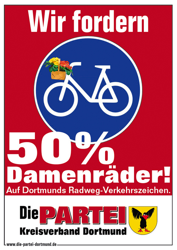 Nachdem SPD und Grüne beschlossen haben, dass künftig bei Dortmunder Ampeln eine Frauenquote von 50 Prozent gelten soll, legt die Partei für Arbeit, Rechtsstaat, Tierschutz, Elitenförderung und basisdemokratische Initiativen – kurz Die PARTEI nach: Auch für Radwegeschilder soll es eine Quote geben.