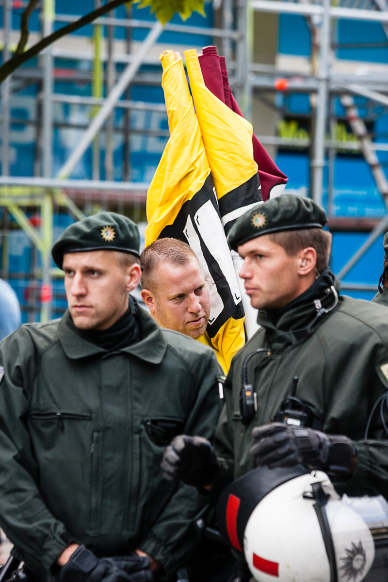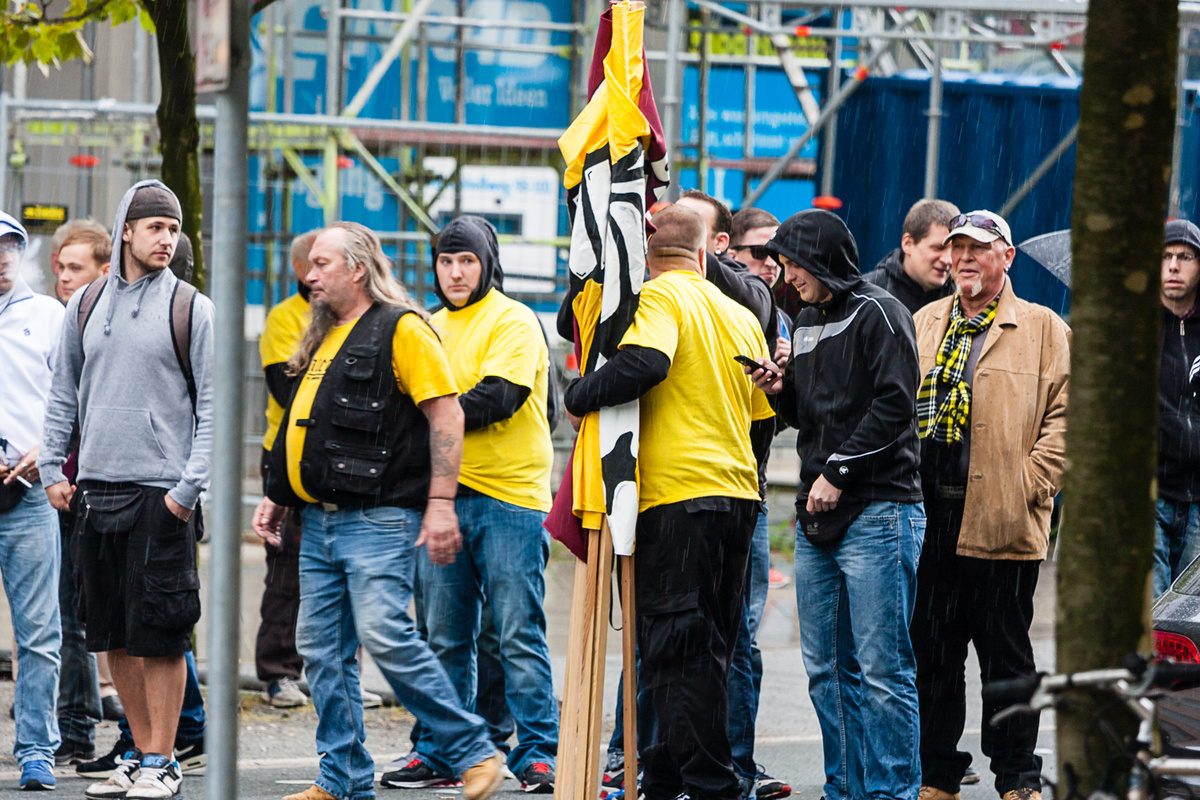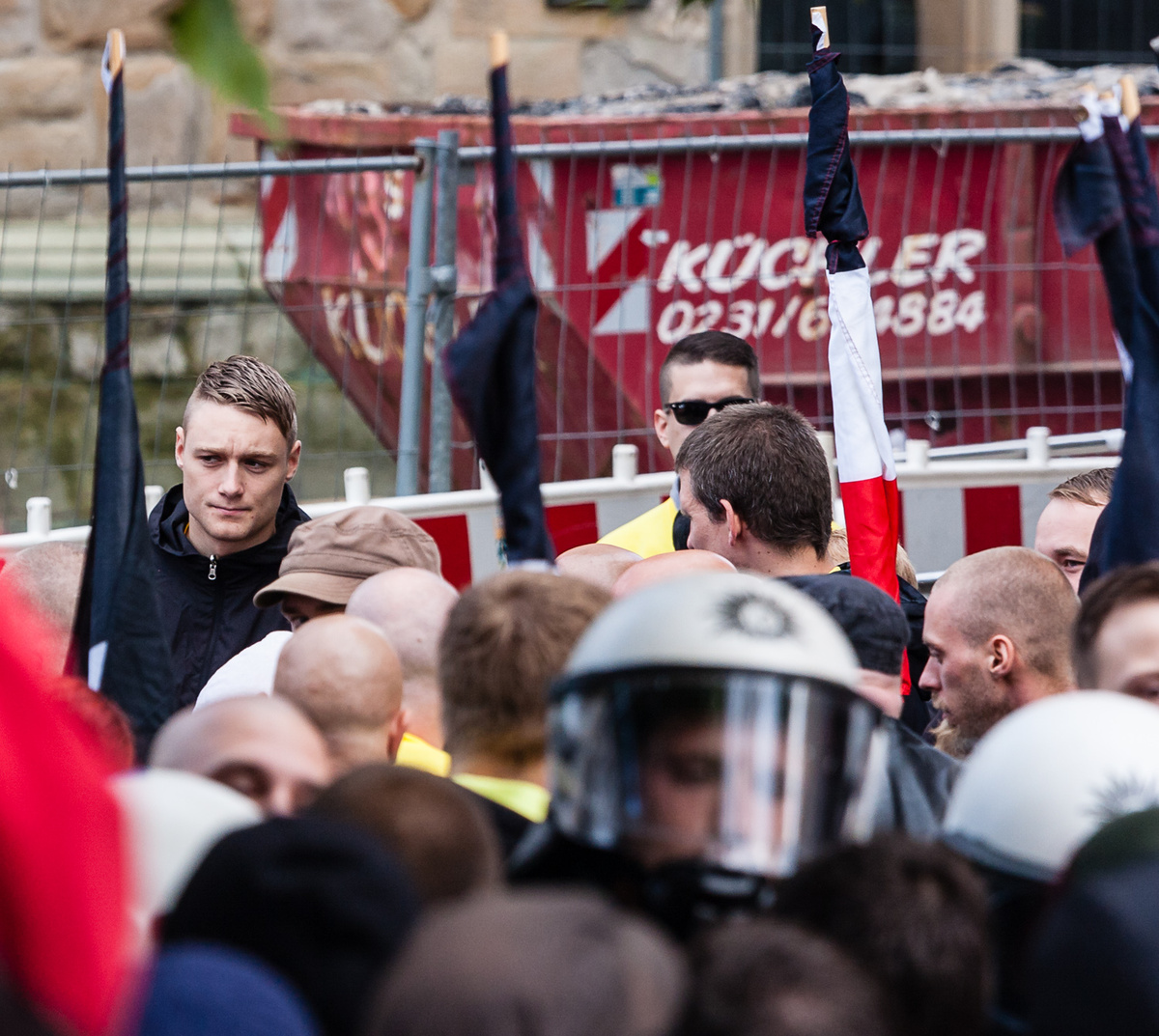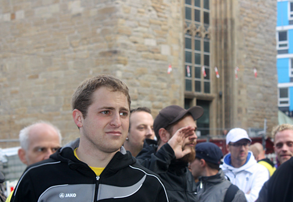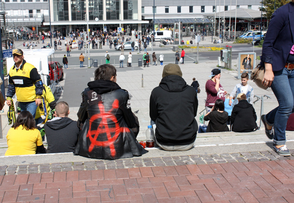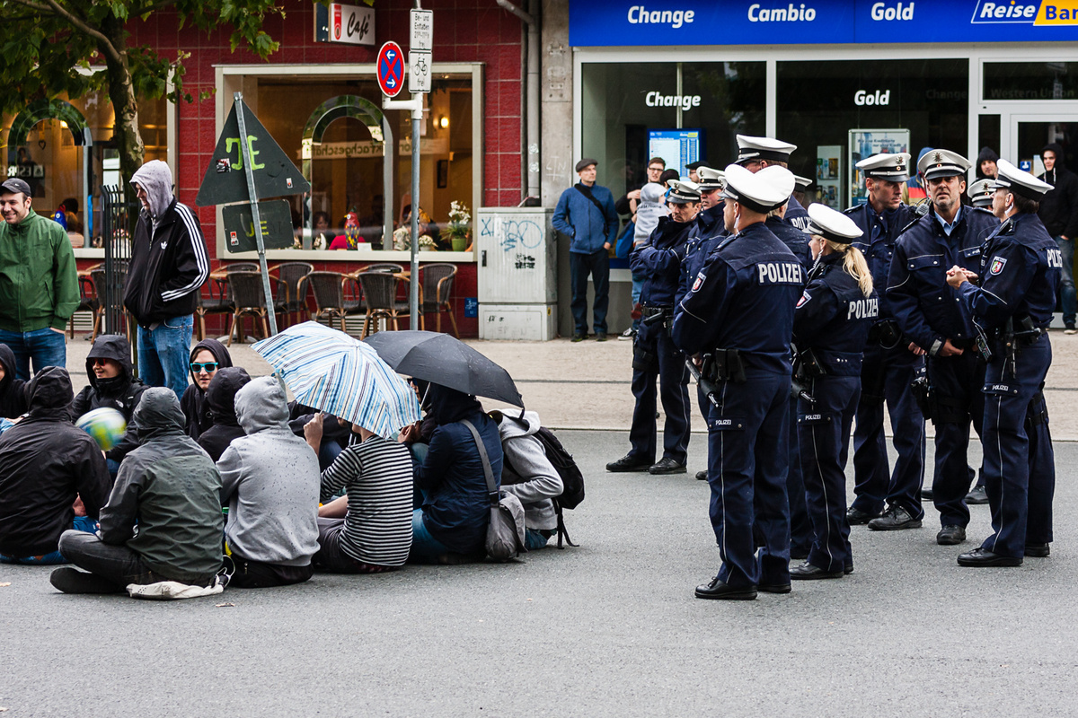 Gestern Nachmittag gegen 15.00 Uhr schien es ein guter Tag für Dortmund zu werden: Das Anti-Nazi Bündnis Blockado hatte die Katharinentreppe friedlich besetzt, gegenüber dem Hauptbahnhof demonstrierten Teilnehmer des Christopher Street Days bunt und laut gegen die Nazis. Die standen zu dieser Zeit auf der Kampstraße, weit entfernt von allen Gegendemonstranten. Ein paar BVB-Fans kickten in sicherer Entfernung von ihnen, die Polizei hatte eine lockere Kette gebildet. Alles sah nach einem entspannten Nachmittag aus. Hätten die Nazis ihre Kundgebung auf der Kampstraße abgehalten – ihr ursprünglicher Zielort war ohnehin nicht erreichbar – wäre es ein ruhiger und etwas verregneter Nachmittag geworden.