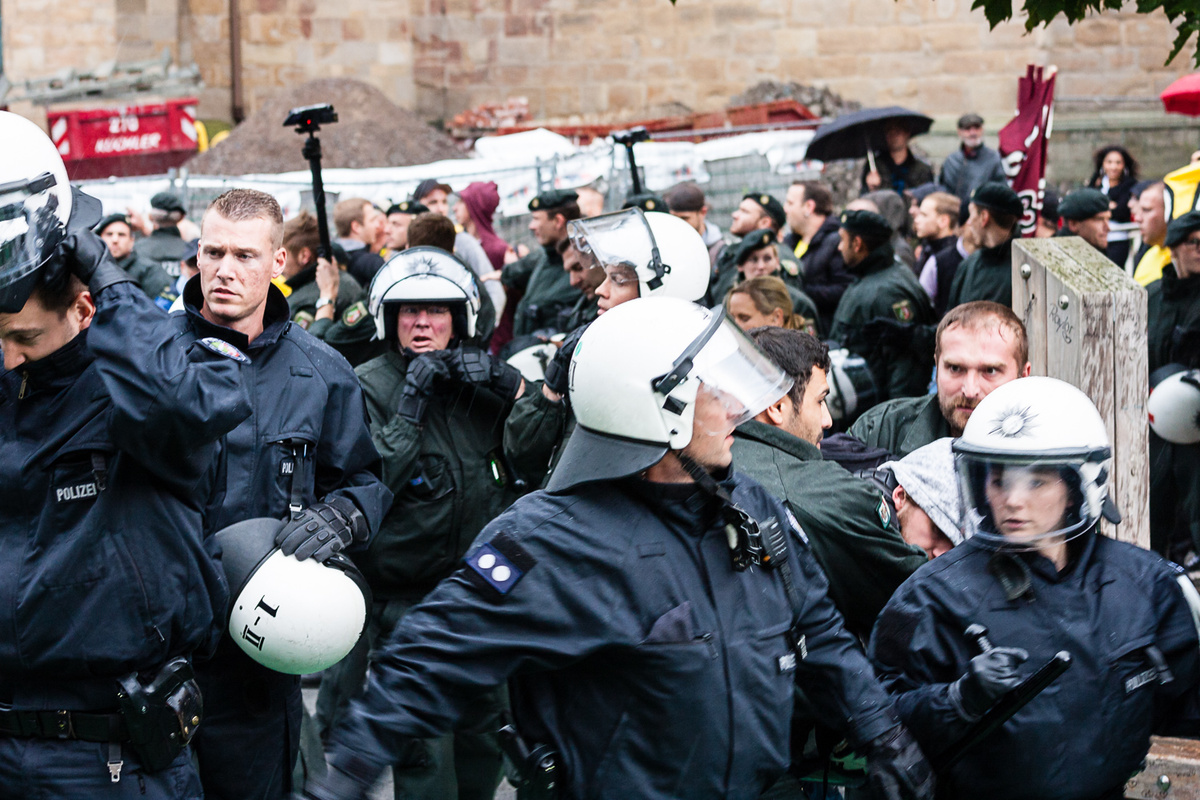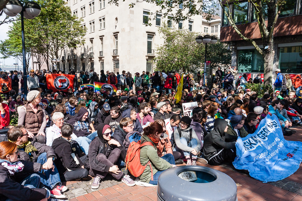 Auch während der Nazi-Kundgebung auf dem Petrikirchhof hatte die Polizei Mühe, die verfeindeten Gruppe zu trennen und einen vernünftigen Abstand herzustellen – wieder rächte sich, dass zu wenige Beamte vor Ort waren. Die Einsatzkräfte die dort waren, wurden so einem unnötigen Risiko ausgesetzt und waren währen der gesamten Kundgebung überfordert.