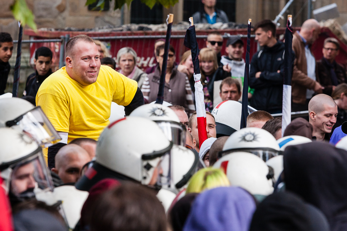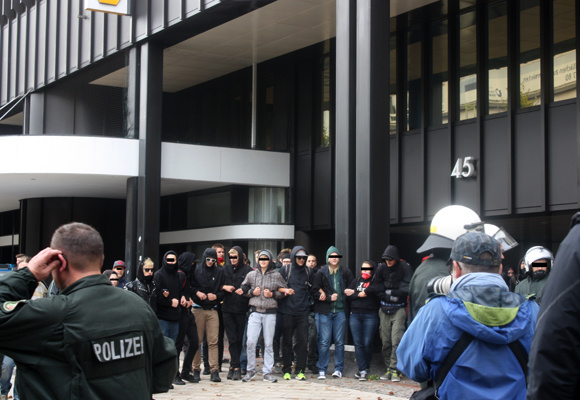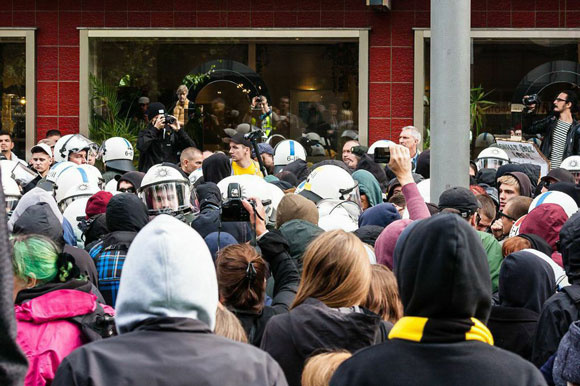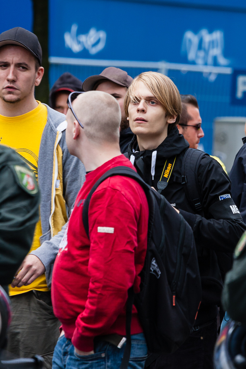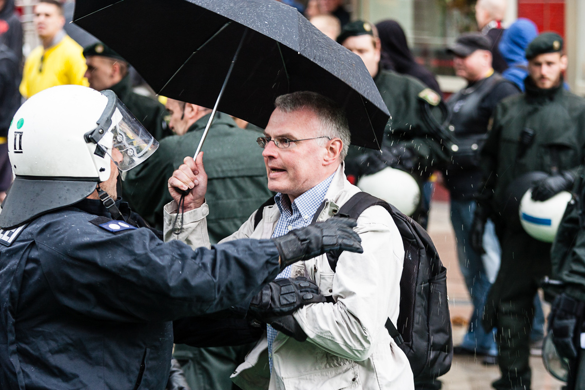 Vollends eskalierte die Lage beim Abmarsch der Nazis, der wieder über die Kampstraße erfolgte, auf der sich kurz vor 17.00 Uhr hunderte Gegendemonstranten eingefunden hatten. Die wenigen Polizeikräfte hatten die Lage nun nicht mehr im Griff: Nazis warfen Flaschen auf die Gegendemonstranten, die warfen Flaschen zurück. 13 Polizeibeamte wurden von Linke verletzt, Nazis griffen Pressevertreter an, Polizeibeamte wurden von Rechtsradikalen mit Pfefferspray angegriffen, Polizisten wurden gegenüber Pressevertreter handgreiflich. Es waren chaotische Szenen. Chaotisch war die Lage dann auch am besetzten Haus in der Nordstadt. Polizei und Nazis erreichten das Haus gleichzeitig und wurden von den Besetzern mit Steinen beworfen. Das dort nicht bereits im Vorfeld Polizeikräfte standen, um ein Zusammentreffen ebenso zu verhindern wie militante Aktionen der Besetzer, ist unbegreiflich.