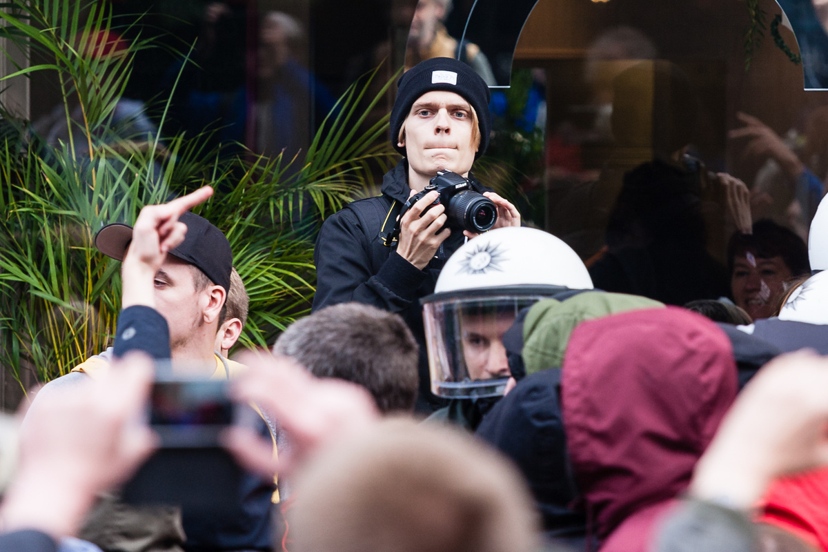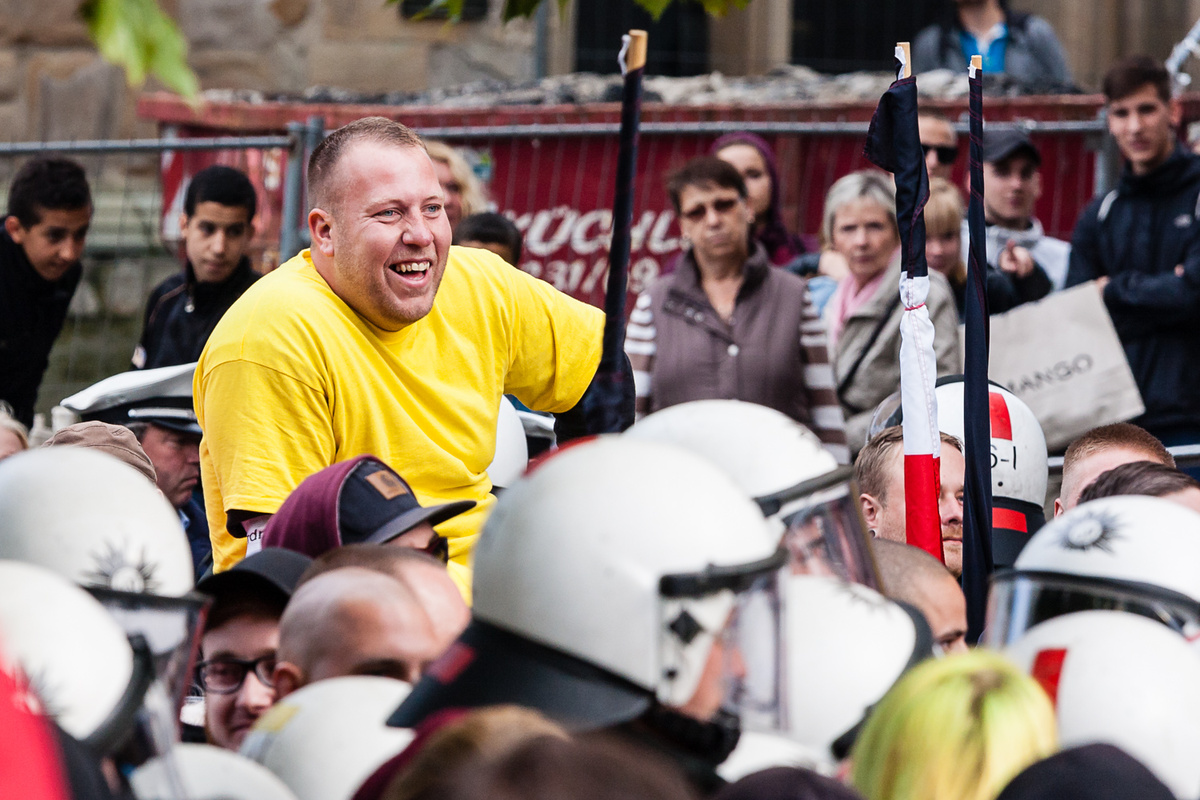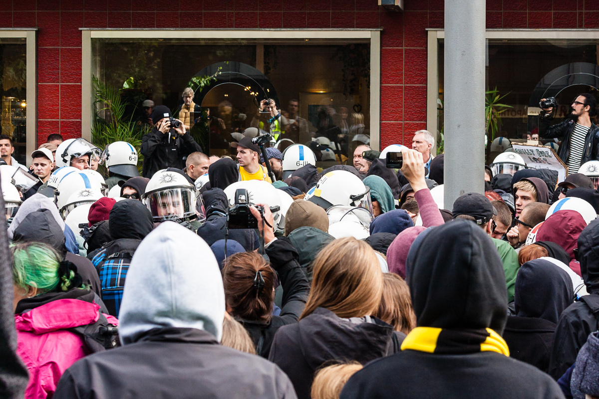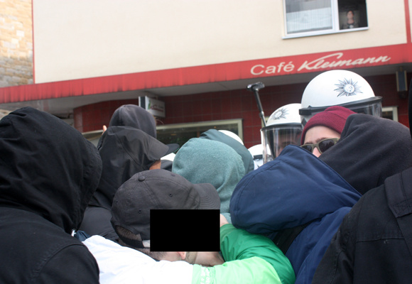 Aber es kam anders. Obwohl die Polizei mit, gemessen an der Situation, deutlich zu geringen Kräften vor Ort war, marschierte die lockere Polizeikette die Kampstraße hinunter, gefolgt von den Nazis, die sich im rechten Teil der Straße an den Hauswänden nach vorne drängelten – wo mittlerweile zahlreiche Nazigegner standen. Die Eskalation der Ereignisse nahm ihren Lauf: Die dünne Polizeikette überdehnte sich und wurde löchrig, einzelne Neonazis rannten auf die Nazi-Gegner zu, was die Polizei nicht verhindern konnte – sie hatte nicht genug Kräfte vor Ort. Alle Seiten wurden durch diesen taktischen Fehler so überrascht, dass sie längere Zeit brauchten, um die Situation zu begreifen, die sich da gerade ergeben hatte. Dass die Polizei die beiden Gruppen wieder trennen konnte bevor die Lage schon hier eskaliert, war pures Glück.