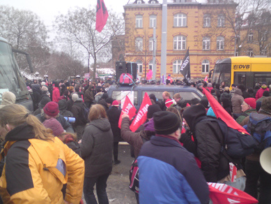 Während also auf der einen Seite des Bahnhofs allzu offenkundige Gegendemonstranten, darunter auch einiges an DGB (s. Foto), nicht weiter vordringen können und Parolen rufen, präsentiert sich am Albertplatz ein entspannteres Bild: Persönlich motivierte Kleingruppen (s. Foto), ver.di-Kleingruppen, eine etwas größere JuSo-Gemeinde und einige andere versprengt bzw. locker organisiert wirkende Gruppen lassen es nicht auf eine größere Versammlung ankommen.