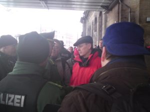 Dort war auch Bodo Ramelow kurz anwesend (s. Foto), kurze Zeit später durften Passanten auch endlich wieder ohne Polizeikontrolle vom Bahnhof Neustadt gen Innenstadt gehen. Am Albertplatz weiter Reden und bunter „Protest“ in Richtung Polizei (s. Foto).