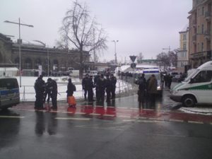 Tatsächlich macht das Polizeiaufgebot um den Bahnhof Neustadt herum (s. Foto) und in Richtung Albertplatz schon Eindruck – es gibt aber bislang kaum Anlass zu direkter Konfrontation: Keine Spur von organisierten Rechten, keinerlei Ausschreitungen von links. Dennoch bewegen sich hin und wieder hektisch Mannschaftswagen von hier nach da. Es geht so sachte auf die angekündigten Kundgebungszeiten zu.
