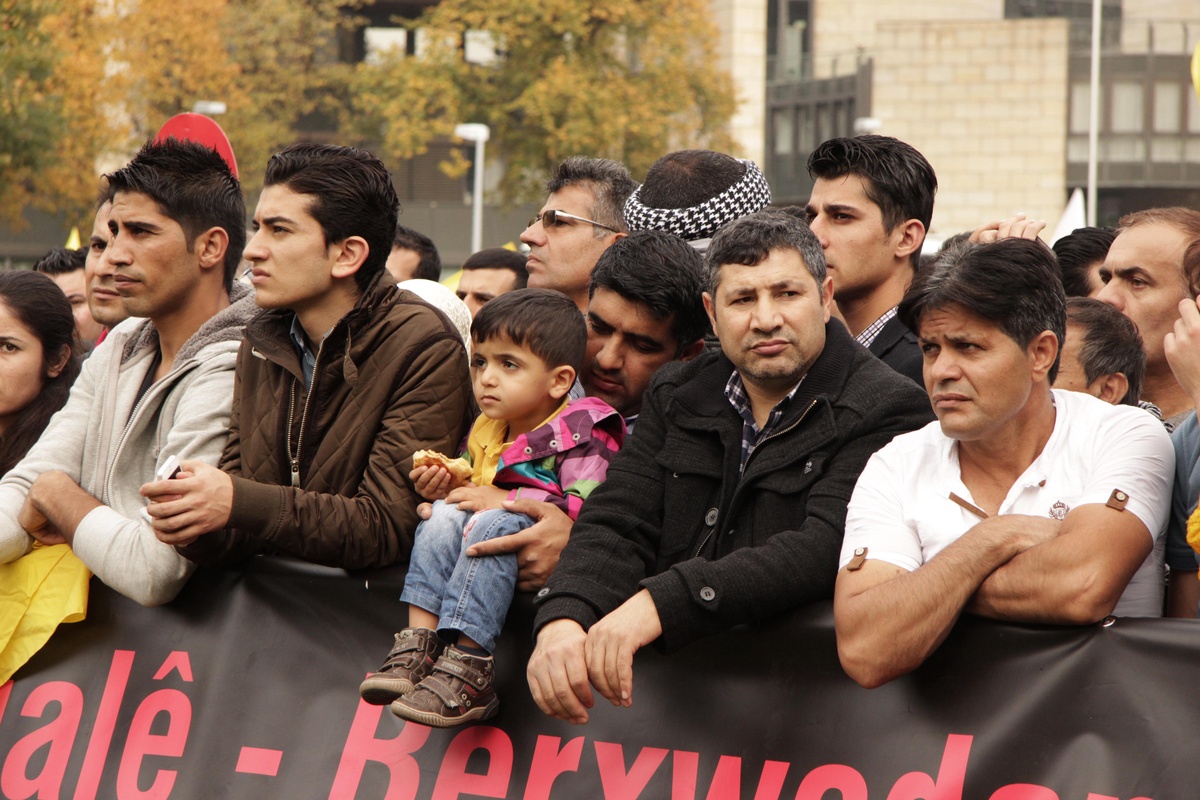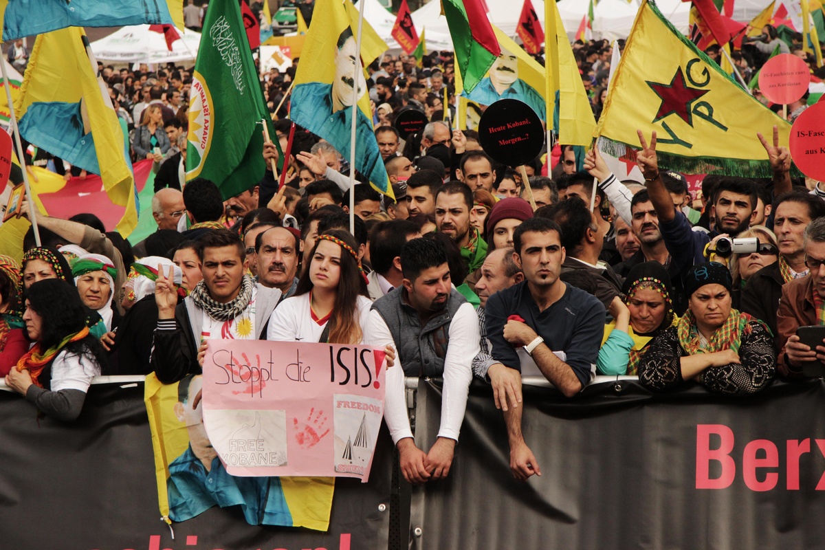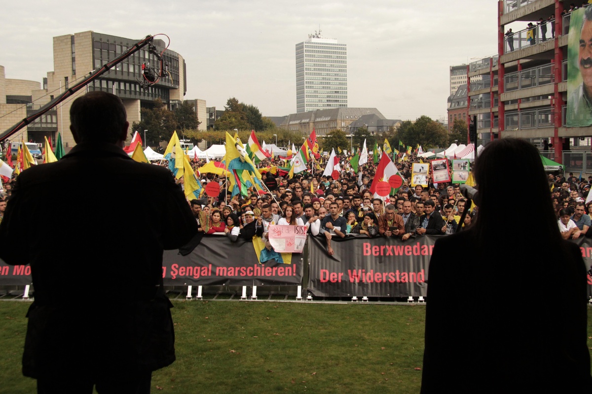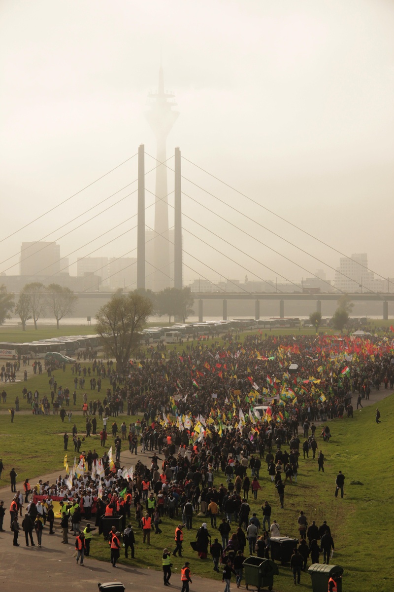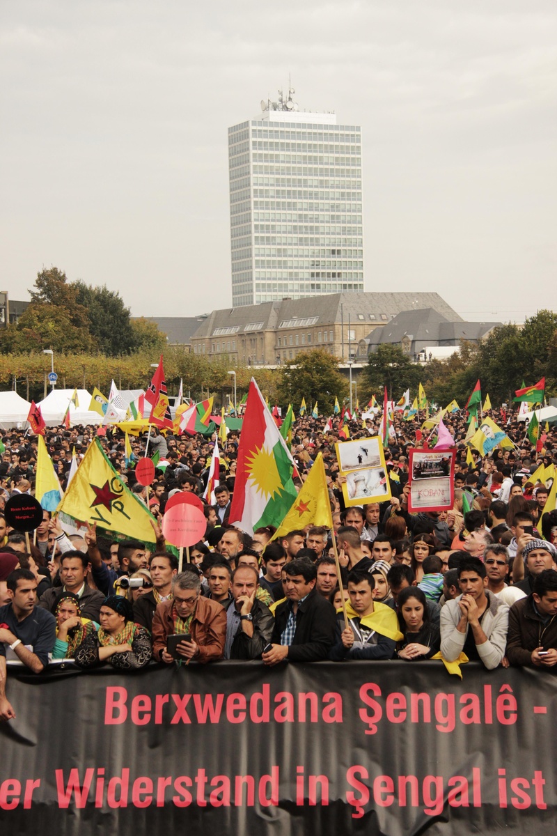 In Düsseldorf haben heute mehr als 20.000 Menschen gegen den Islamischen Staat und für den kurdischen Widerstand gegen die Islamisten in Kobanî demonstriert. Genaue Angaben zu den Teilnehmerzahlen gestalten sich schwierig: Die Düsseldorfer Polizei spricht von 21.000 Demonstranten, das kurdische Zentrum für Öffentlichkeitsarbeit „Civaka Azad“ spricht seinerseits von über 80.000. Es dürften zumindest deutlich mehr als 20.000 Menschen auf der Straße gewesen sein. Unstrittig ist, dass die Demonstration entgegen vorheriger Befürchtungen des Verfassungsschutzes friedlich blieb.