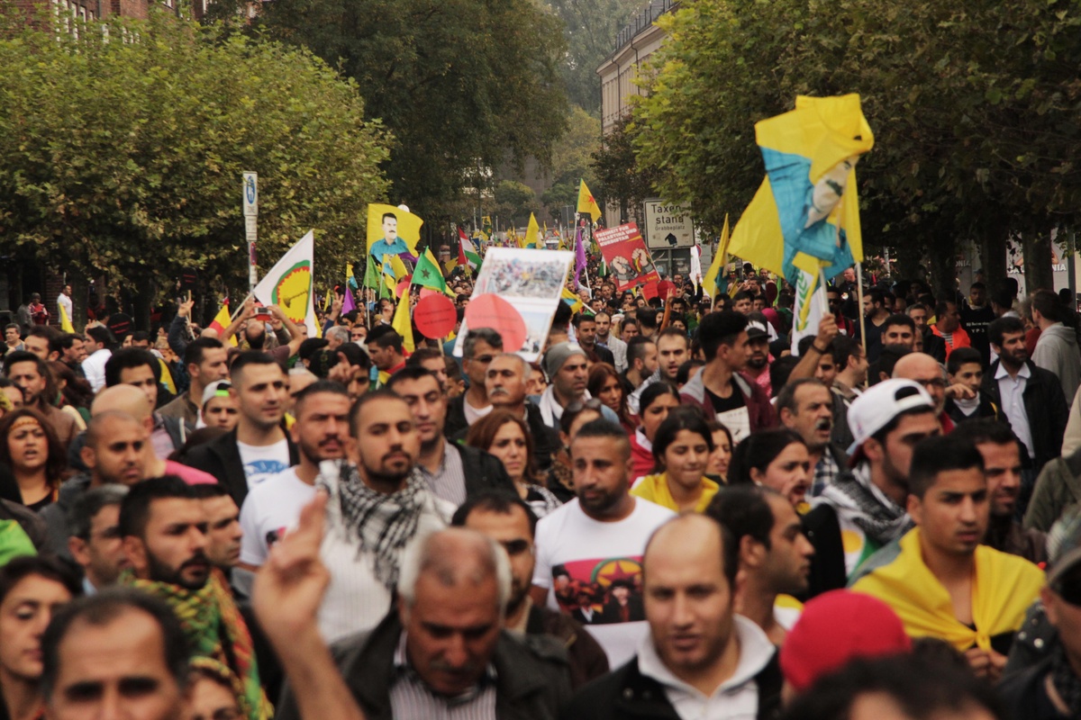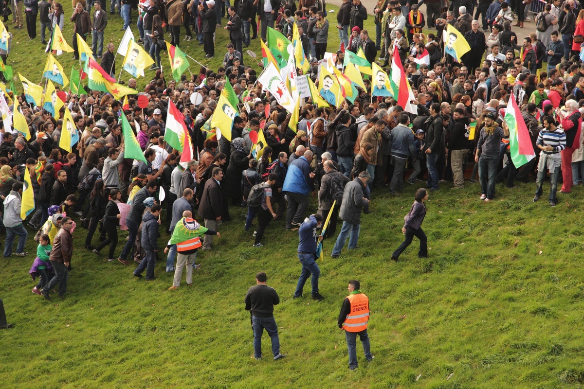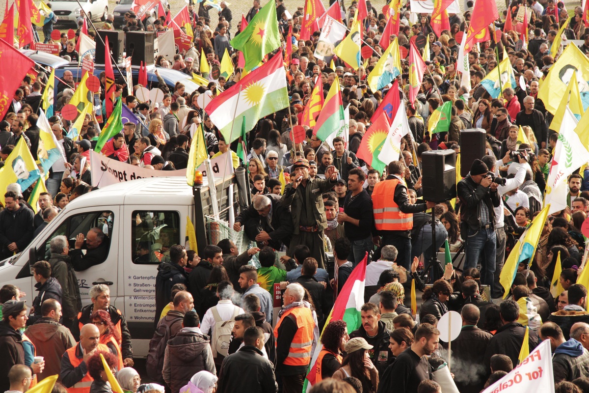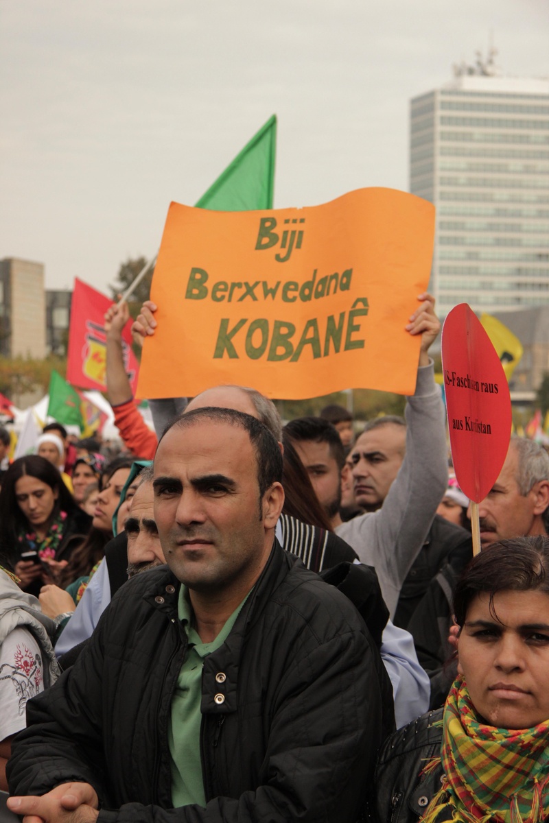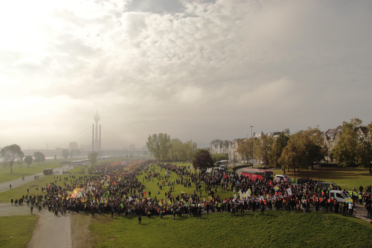 In Düsseldorf haben heute mehr als 20.000 Menschen gegen den Islamischen Staat und für den kurdischen Widerstand gegen die Islamisten in Kobanî demonstriert. Genaue Angaben zu den Teilnehmerzahlen gestalten sich schwierig: Die Düsseldorfer Polizei spricht von 21.000 Demonstranten, das kurdische Zentrum für Öffentlichkeitsarbeit „Civaka Azad“ spricht seinerseits von über 80.000. Es dürften zumindest deutlich mehr als 20.000 Menschen auf der Straße gewesen sein. Unstrittig ist, dass die Demonstration entgegen vorheriger Befürchtungen des Verfassungsschutzes friedlich blieb.