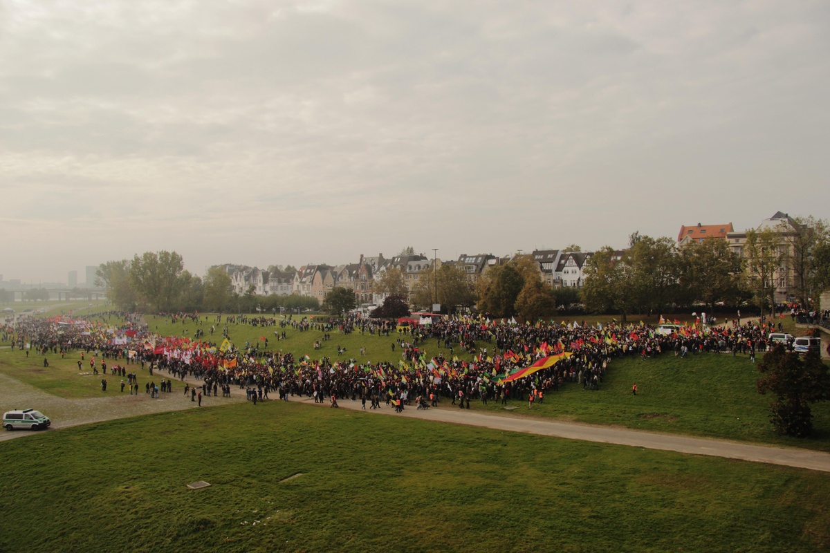 Als die Spitze der Demonstration nach gut der Hälfte der Strecke auf dem Burgplatz in der Düsseldorfer Innenstadt angekommen war, stand das Ende immernoch auf dem Auftaktplatz auf der anderen Seite des Rheins.