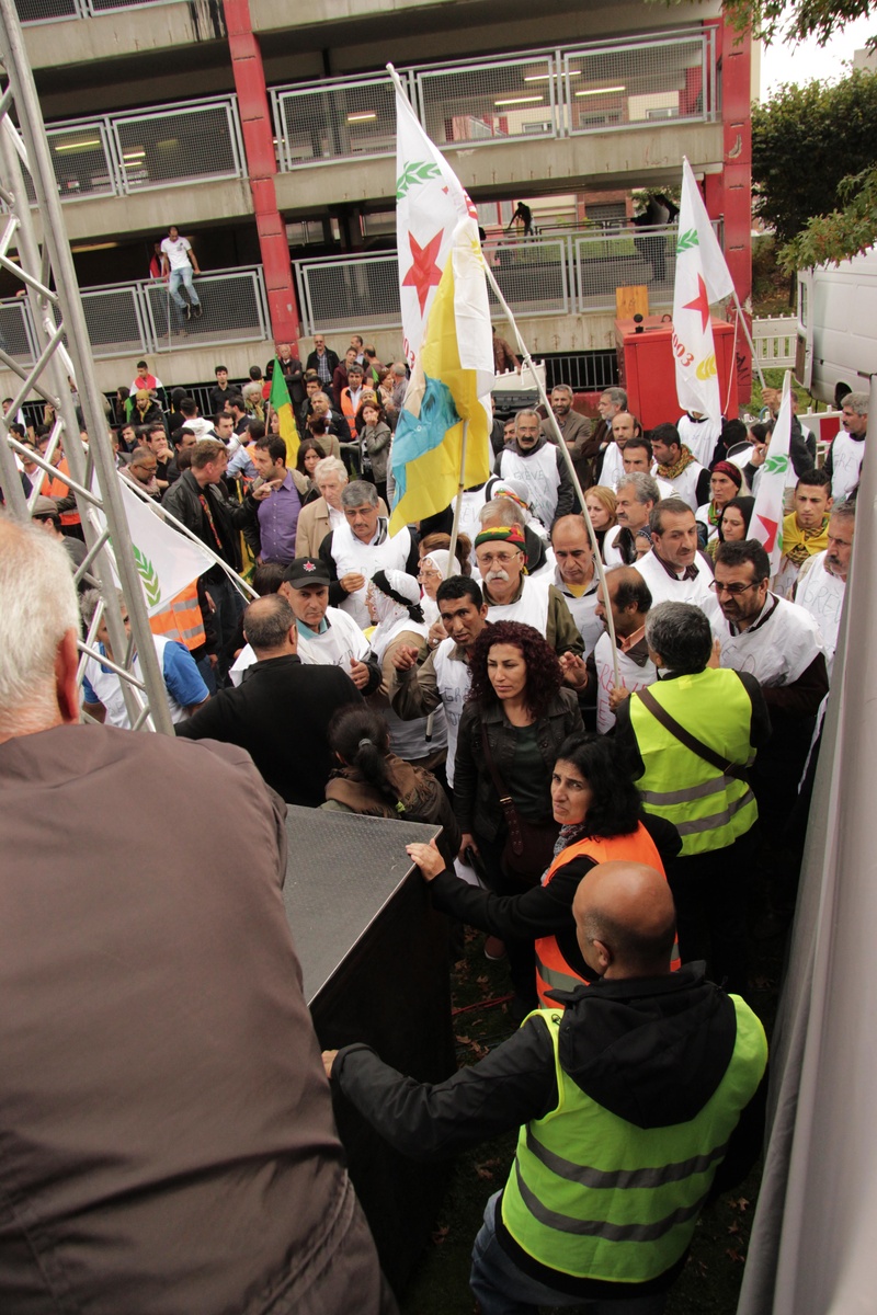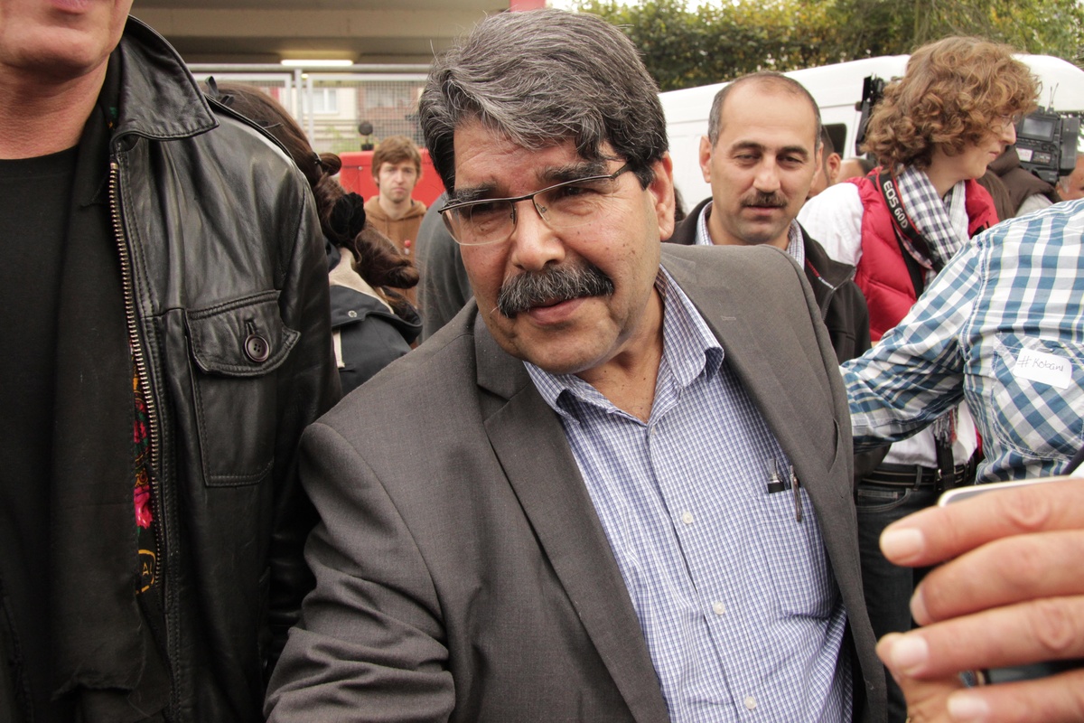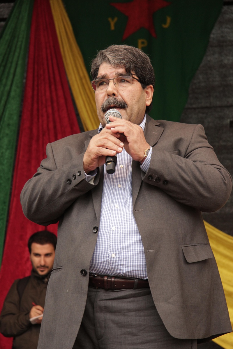 Vor dem Landtag sprachen dann unter anderem ein Vertreter von „NAV-DEM“ und Salih Muslim, Co-Vorsitzender der „Partei der Demokratischen Union“ (PYD) aus Syrien zu den Demonstranten. Als Vorsitzender der als PKK-nah geltenden Partei ist Muslim eins der Einflussreichsten Mitglieder der Kurdischen Opposition im Syrischen Bürgerkrieg. Muslim sprach auf kurdisch und englisch und bedankte sich bei den Teilnehmern der Demonstration für ihre Solidarität. In Kobanî werde nicht nur das Leben der Menschen vor Ort verteidigt, sondern auch die Demokratie und menschliche Werte. Er bedankte sich ausdrücklich auch für die Bombardierung von IS-Stellungen um Kobanî in den vergangenen Tagen durch die USA.