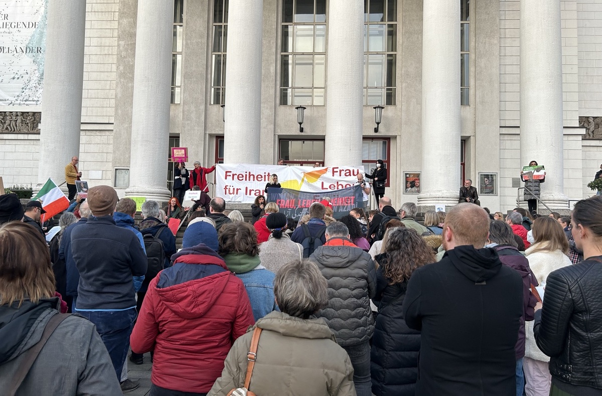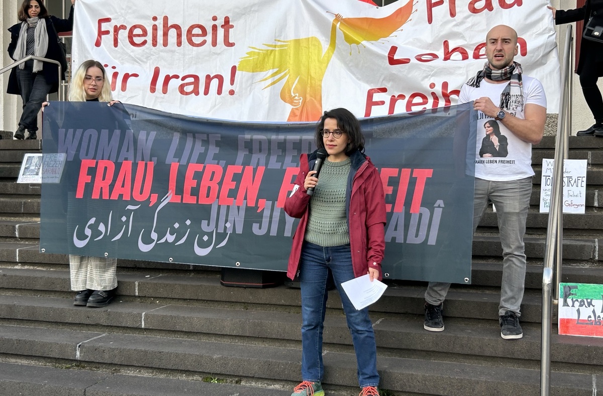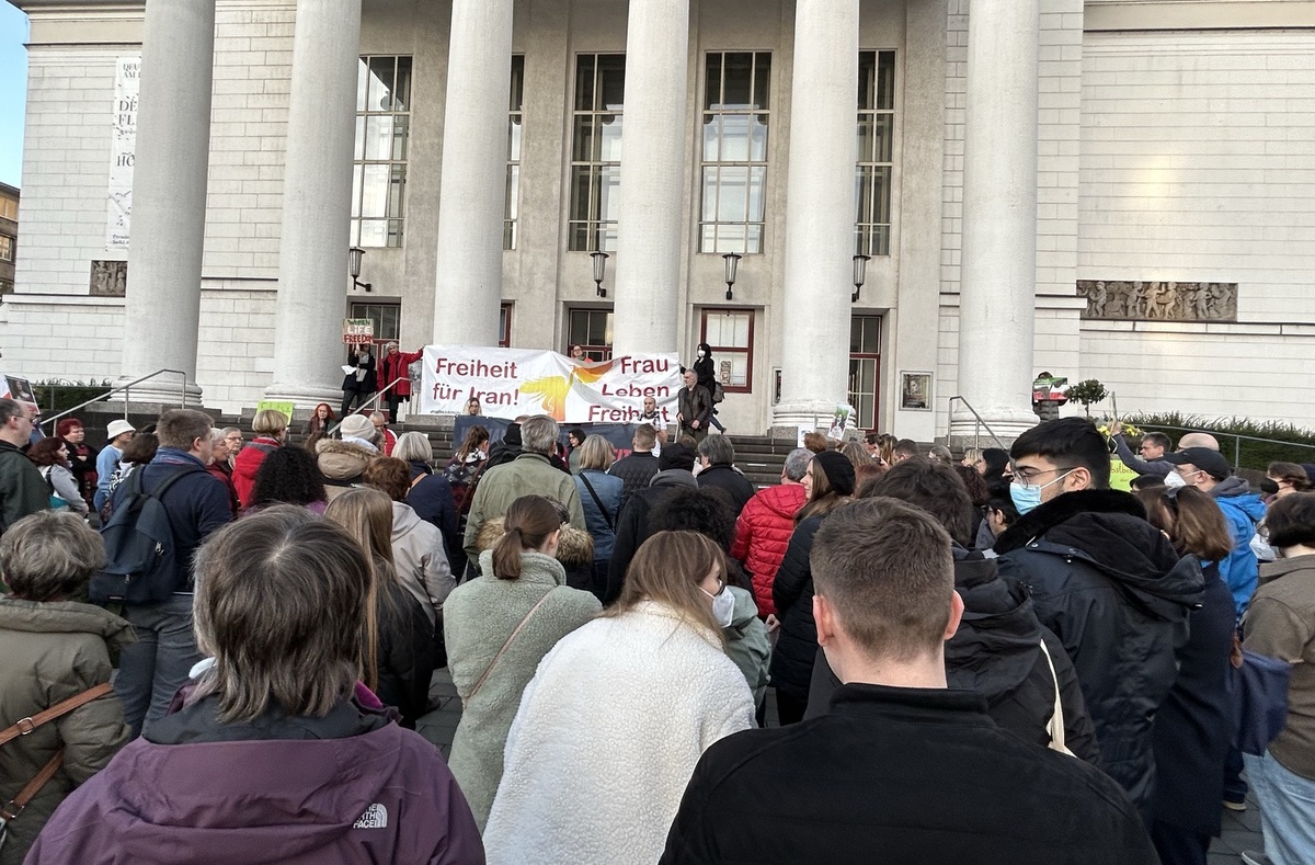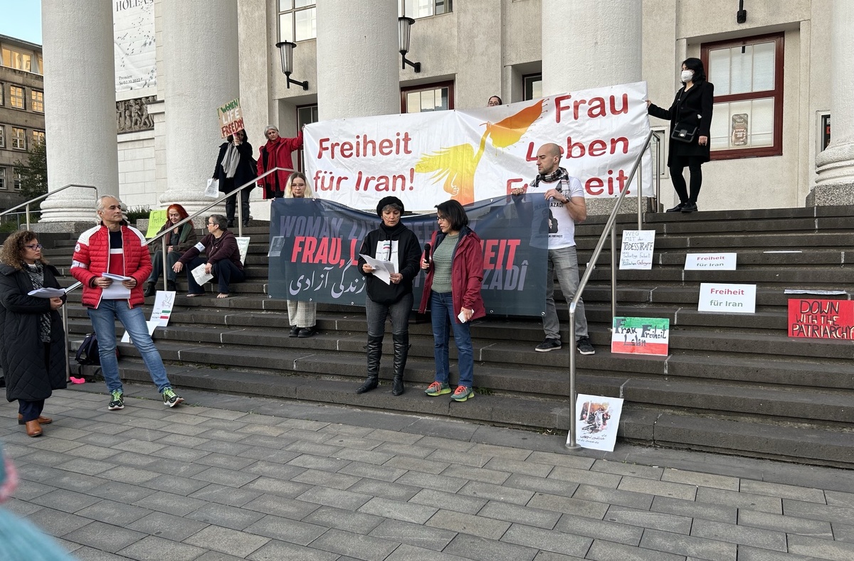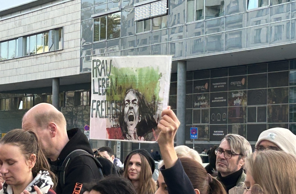 „Frau, Leben, Freiheit“ – der Schlachtruf der iranischen Freiheitsbewegung – war auf zahlreichen mitgebrachten Schildern und Bannen zu lesen und ertönte immer wieder auf deutsch und persisch.